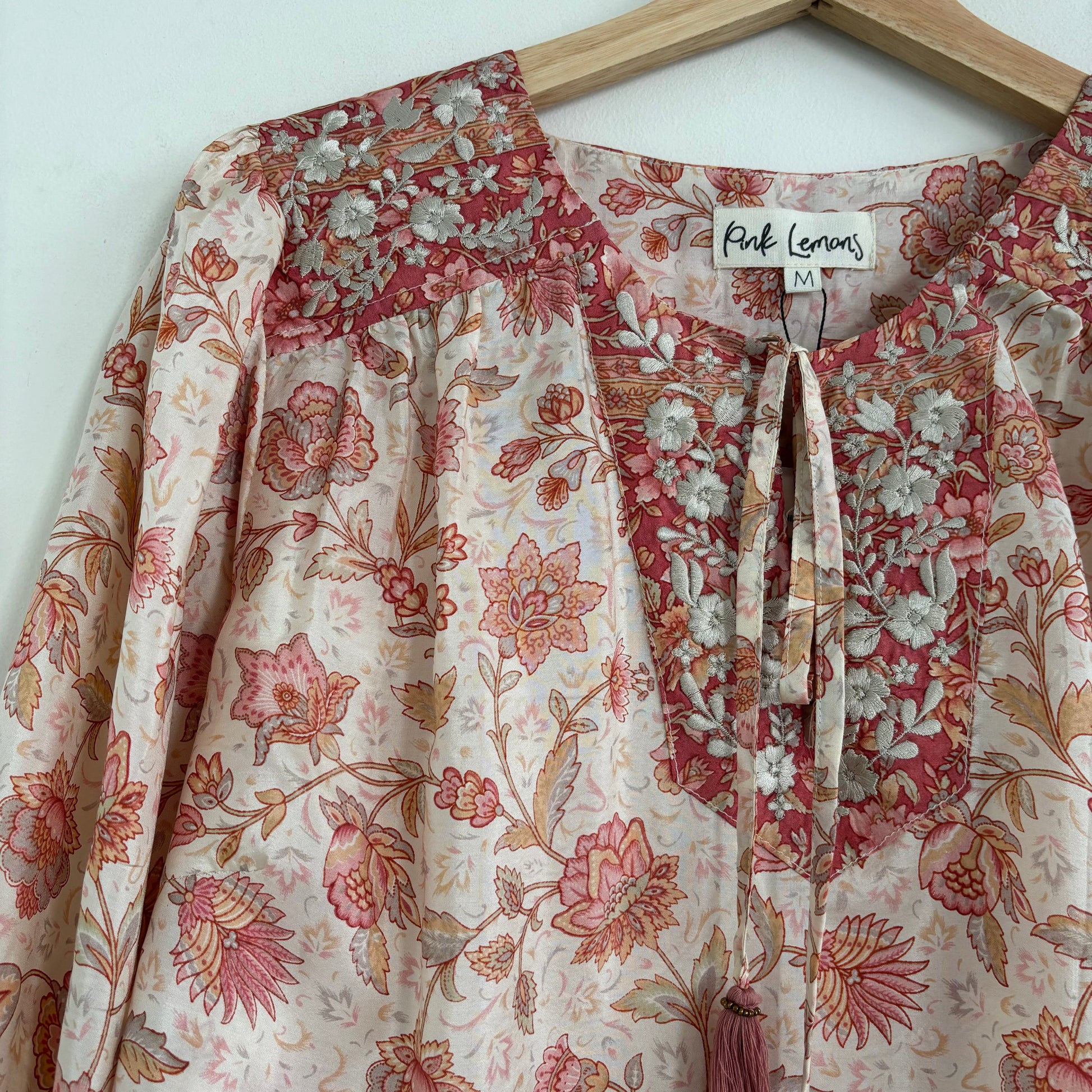 Lolita blouse has a loose breezy, feminine shape with puff shoulder detail and a front yoke with tassel ties. Lolita exudes charm and elegance with pretty embroidery detail on the shoulders and front yoke ,she looks great with jeans , linen pants and skirts /shorts alike , she can be dressed up or down to suit the occasion. It has a swing shape that can be worn loose or tucked in . Super versatile .
