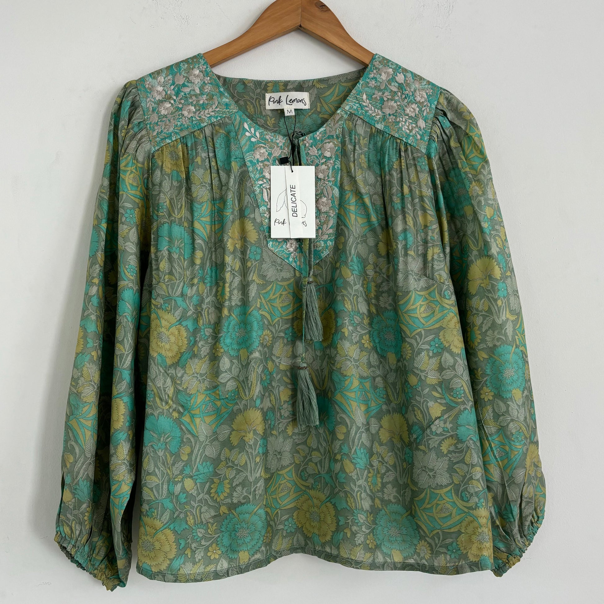 Lolita blouse has a loose breezy, feminine shape with puff shoulder detail and a front yoke with tassel ties. Lolita exudes charm and elegance with pretty embroidery detail on the shoulders and front yoke ,she looks great with jeans , linen pants and skirts /shorts alike , she can be dressed up or down to suit the occasion. It has a swing shape that can be worn loose or tucked in . Super versatile .