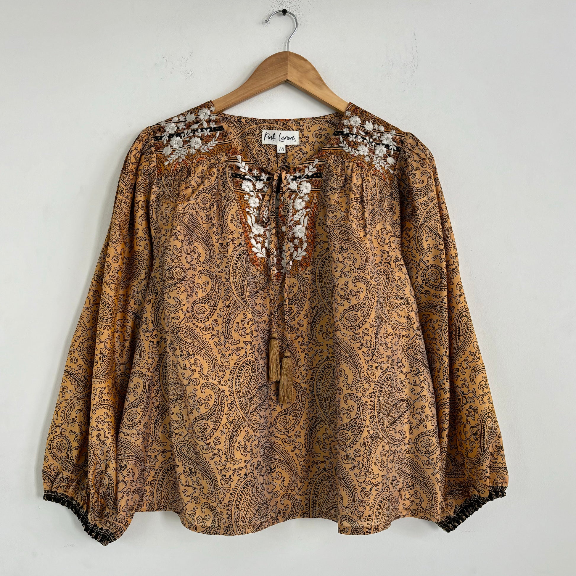 Lolita blouse has a loose breezy, feminine shape with puff shoulder detail and a front yoke with tassel ties. Lolita exudes charm and elegance with pretty embroidery detail on the shoulders and front yoke ,she looks great with jeans , linen pants and skirts /shorts alike , she can be dressed up or down to suit the occasion. It has a swing shape that can be worn loose or tucked in . Super versatile .