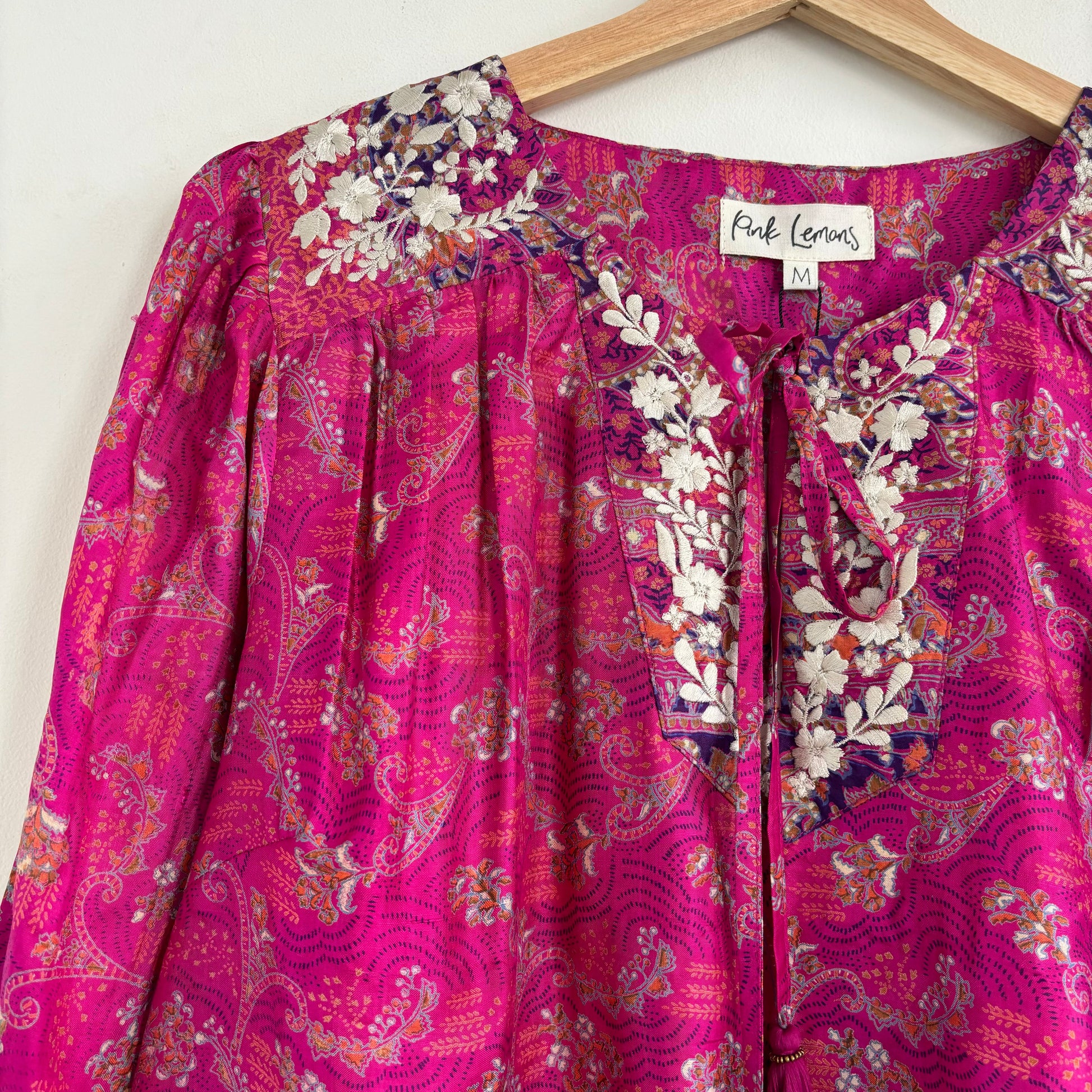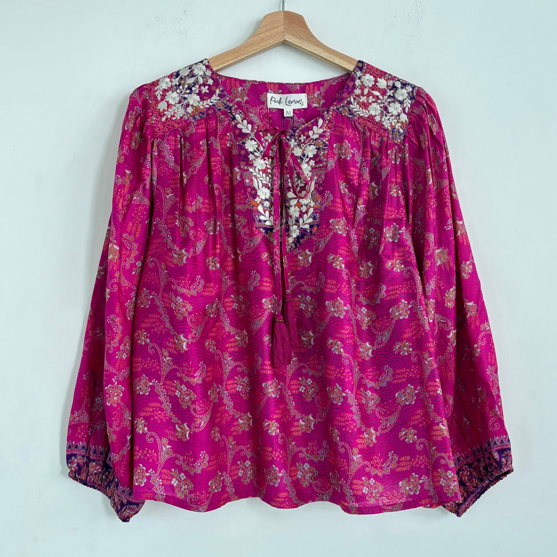 Lolita blouse has a loose breezy, feminine shape with puff shoulder detail and a front yoke with tassel ties. Lolita exudes charm and elegance with pretty embroidery detail on the shoulders and front yoke ,she looks great with jeans , linen pants and skirts /shorts alike , she can be dressed up or down to suit the occasion. It has a swing shape that can be worn loose or tucked in . Super versatile .