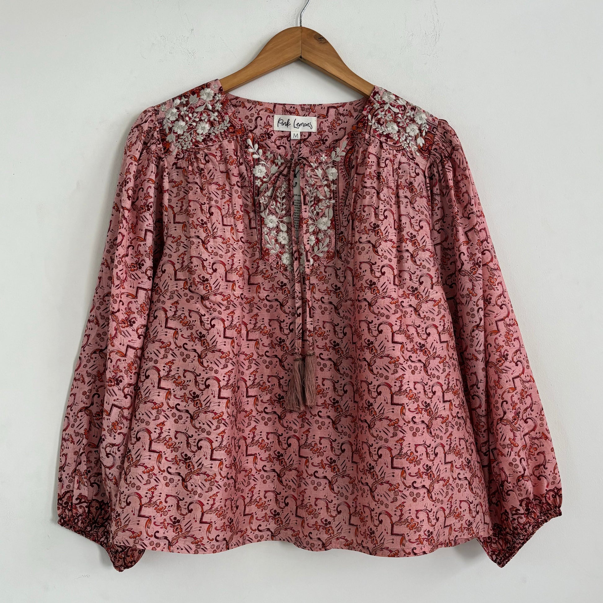Lolita blouse has a loose breezy, feminine shape with puff shoulder detail and a front yoke with tassel ties. Lolita exudes charm and elegance with pretty embroidery detail on the shoulders and front yoke ,she looks great with jeans , linen pants and skirts /shorts alike , she can be dressed up or down to suit the occasion. It has a swing shape that can be worn loose or tucked in . Super versatile .