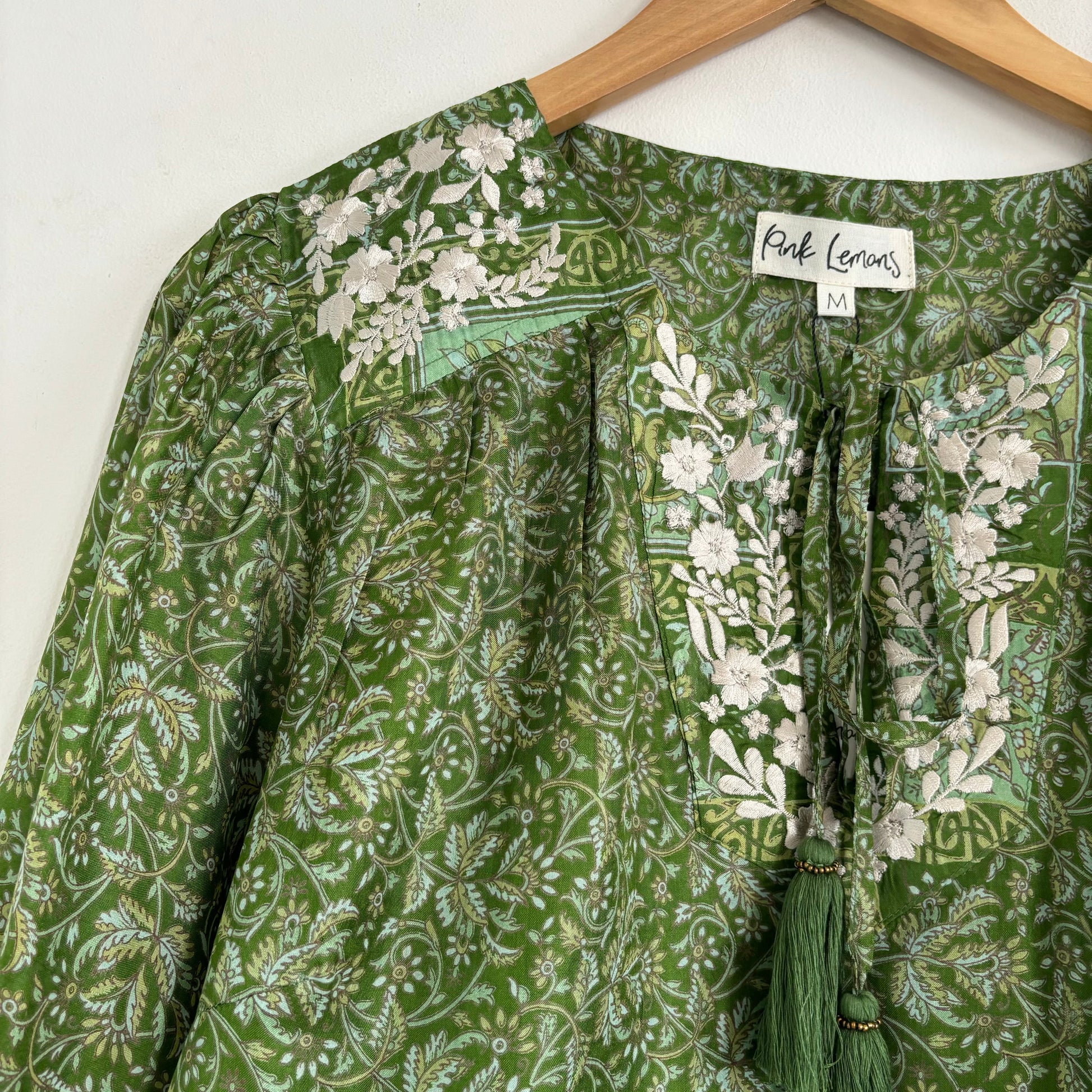 Lolita blouse has a loose breezy, feminine shape with puff shoulder detail and a front yoke with tassel ties. Lolita exudes charm and elegance with pretty embroidery detail on the shoulders and front yoke ,she looks great with jeans , linen pants and skirts /shorts alike , she can be dressed up or down to suit the occasion. It has a swing shape that can be worn loose or tucked in . Super versatile .