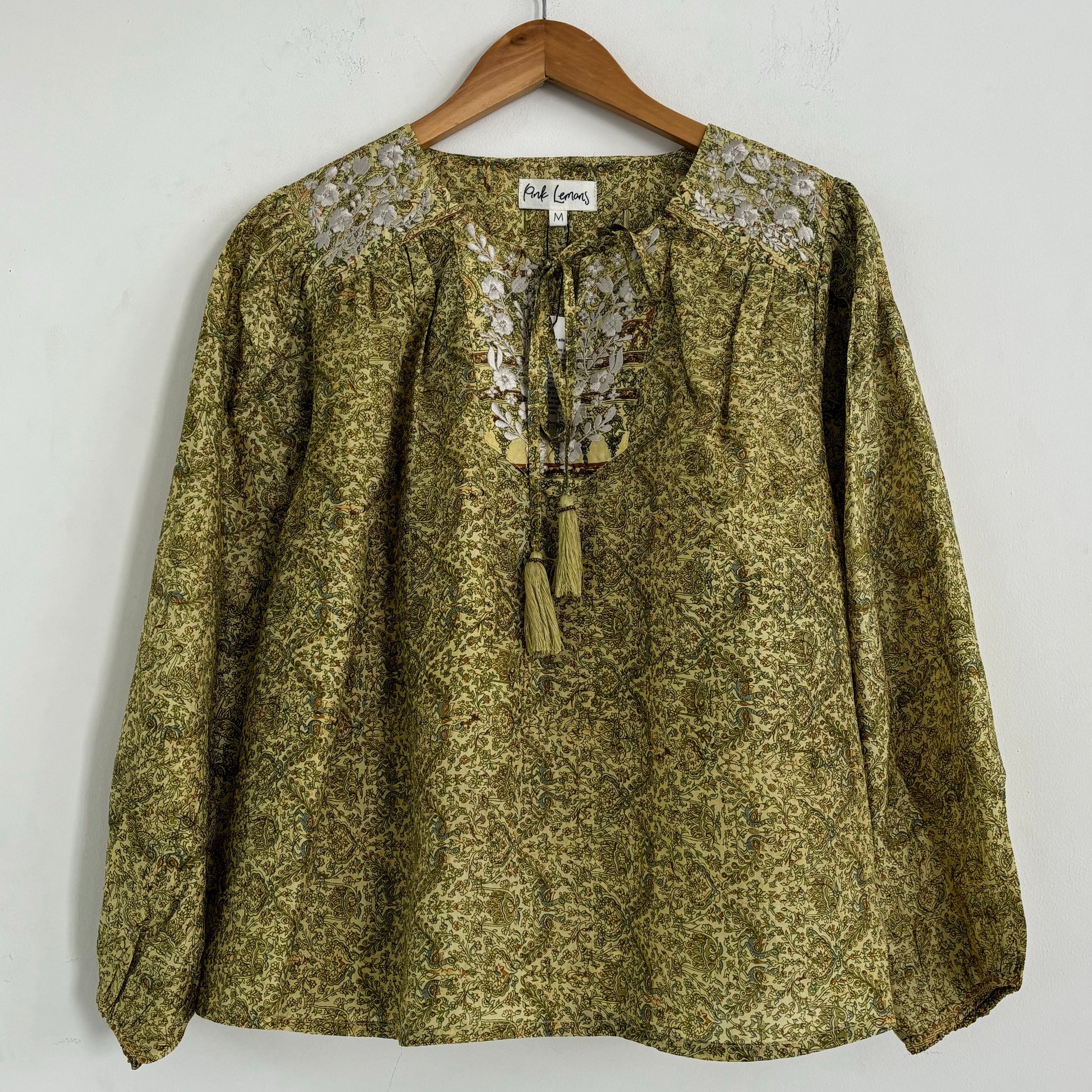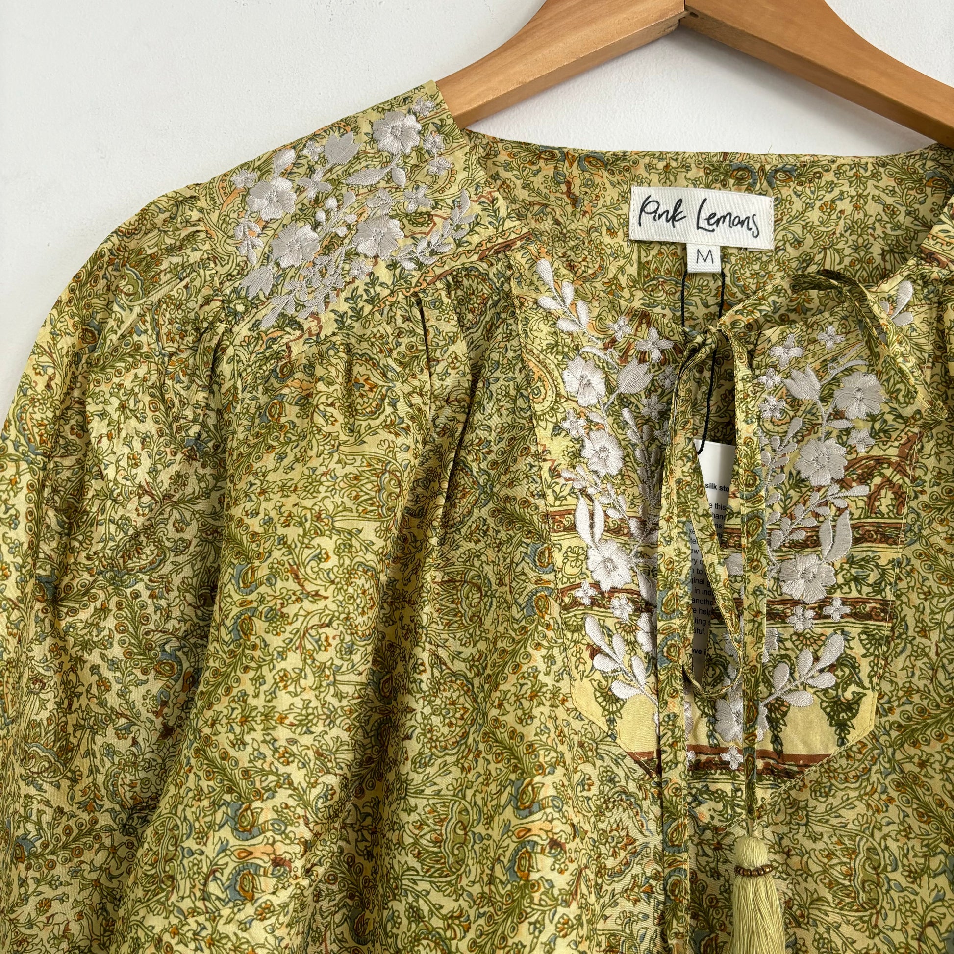 Lolita blouse has a loose breezy, feminine shape with puff shoulder detail and a front yoke with tassel ties. Lolita exudes charm and elegance with pretty embroidery detail on the shoulders and front yoke ,she looks great with jeans , linen pants and skirts /shorts alike , she can be dressed up or down to suit the occasion. It has a swing shape that can be worn loose or tucked in . Super versatile .