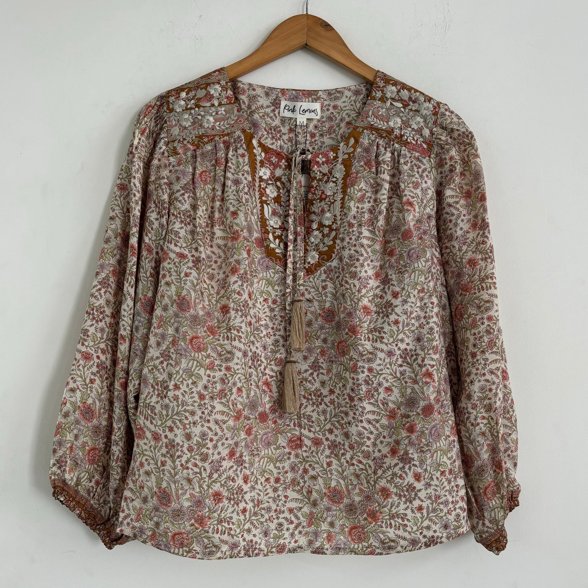 Lolita blouse has a loose breezy, feminine shape with puff shoulder detail and a front yoke with tassel ties. Lolita exudes charm and elegance with pretty embroidery detail on the shoulders and front yoke ,she looks great with jeans , linen pants and skirts /shorts alike , she can be dressed up or down to suit the occasion. It has a swing shape that can be worn loose or tucked in . Super versatile .