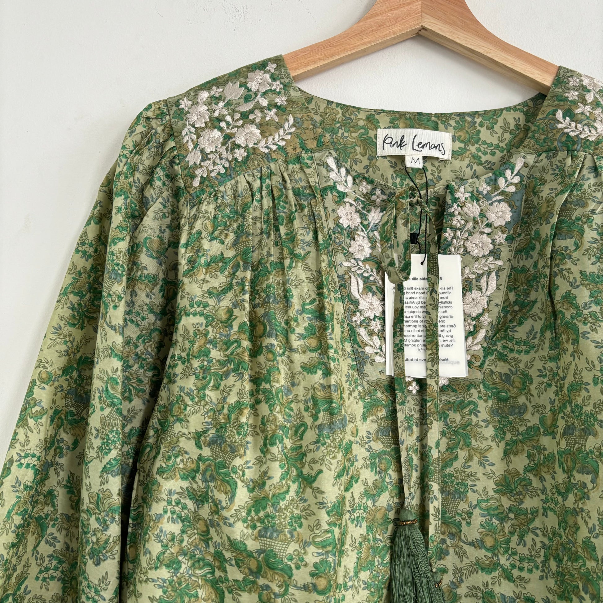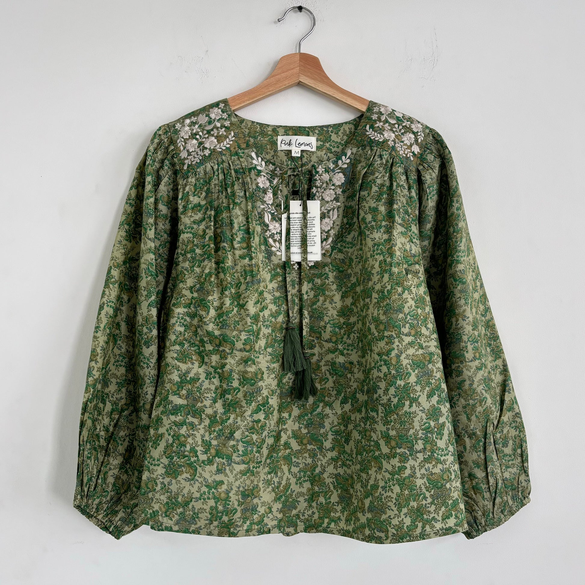 Lolita blouse has a loose breezy, feminine shape with puff shoulder detail and a front yoke with tassel ties. Lolita exudes charm and elegance with pretty embroidery detail on the shoulders and front yoke ,she looks great with jeans , linen pants and skirts /shorts alike , she can be dressed up or down to suit the occasion. It has a swing shape that can be worn loose or tucked in . Super versatile .