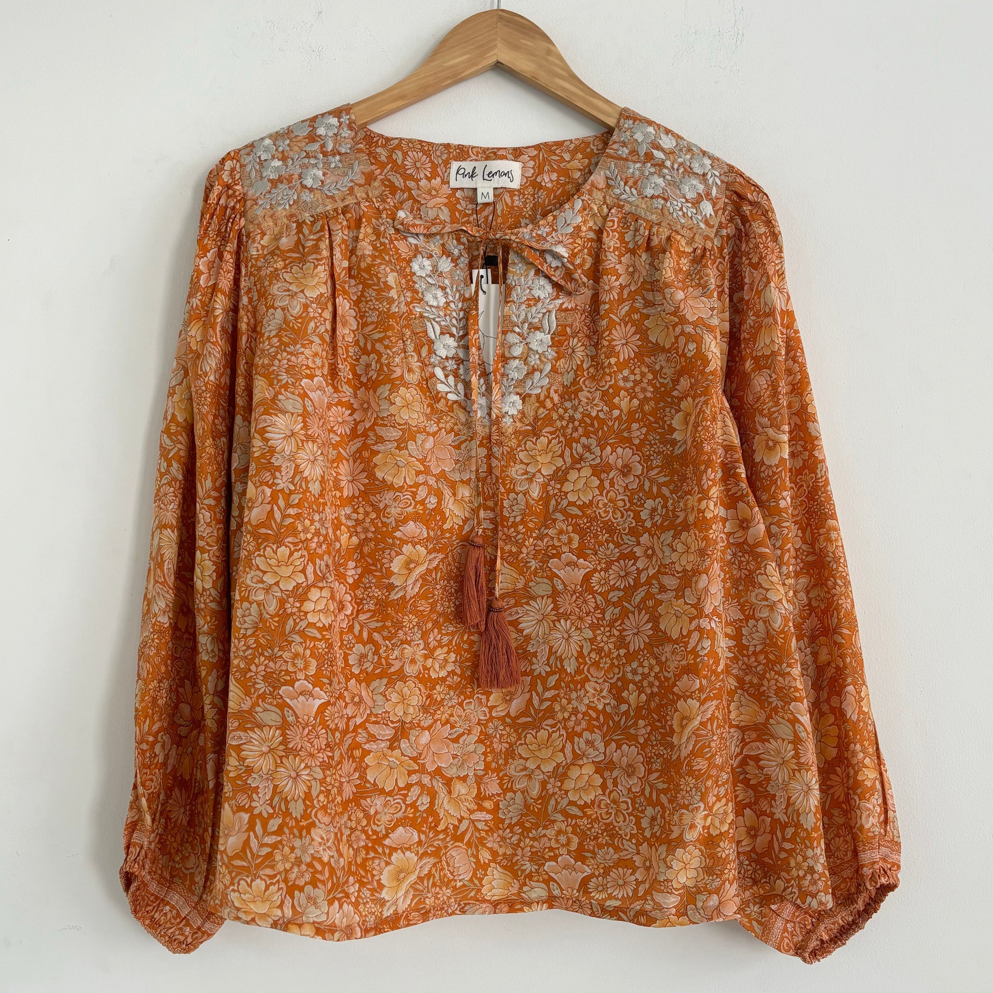 Lolita blouse has a loose breezy, feminine shape with puff shoulder detail and a front yoke with tassel ties. Lolita exudes charm and elegance with pretty embroidery detail on the shoulders and front yoke ,she looks great with jeans , linen pants and skirts /shorts alike , she can be dressed up or down to suit the occasion. It has a swing shape that can be worn loose or tucked in . Super versatile .