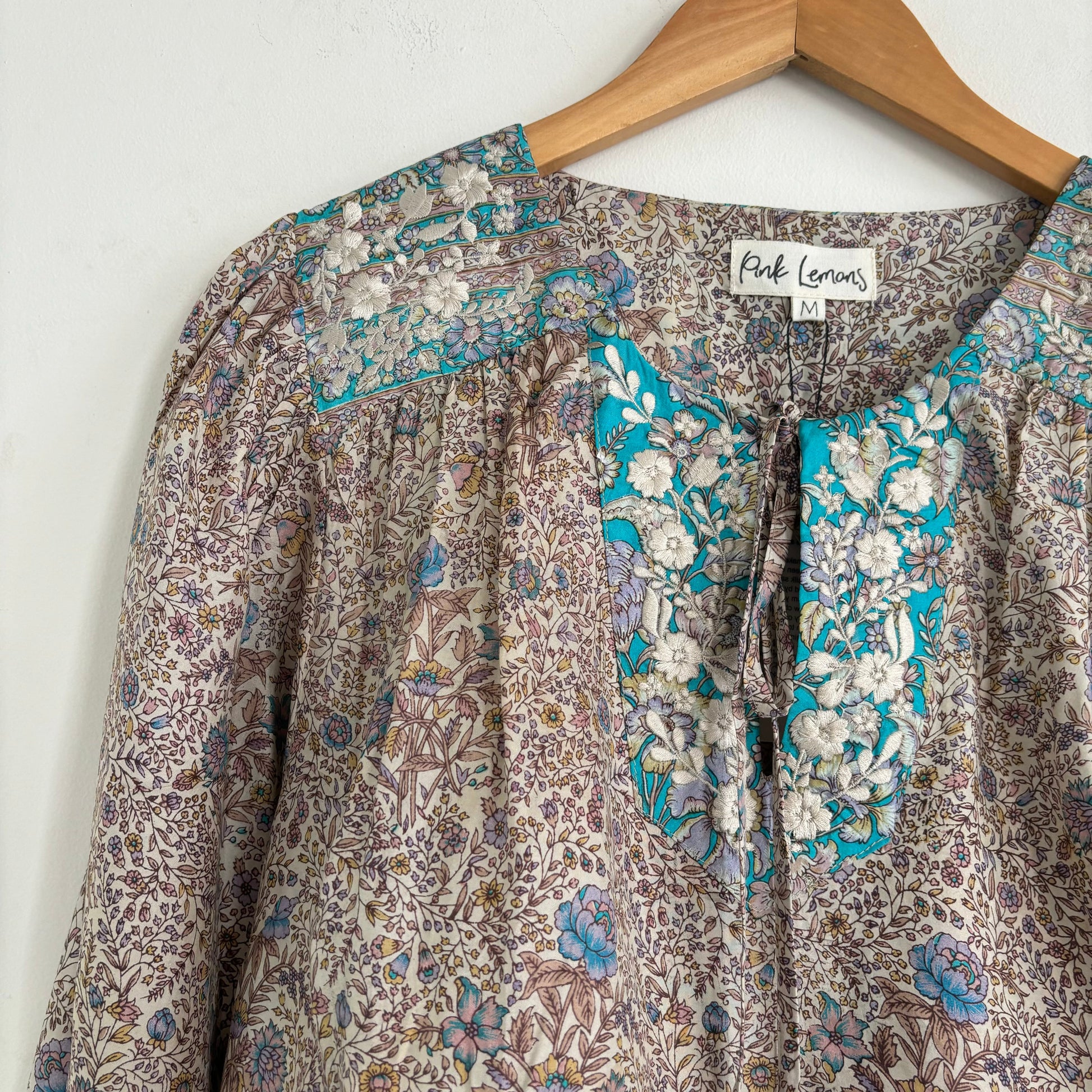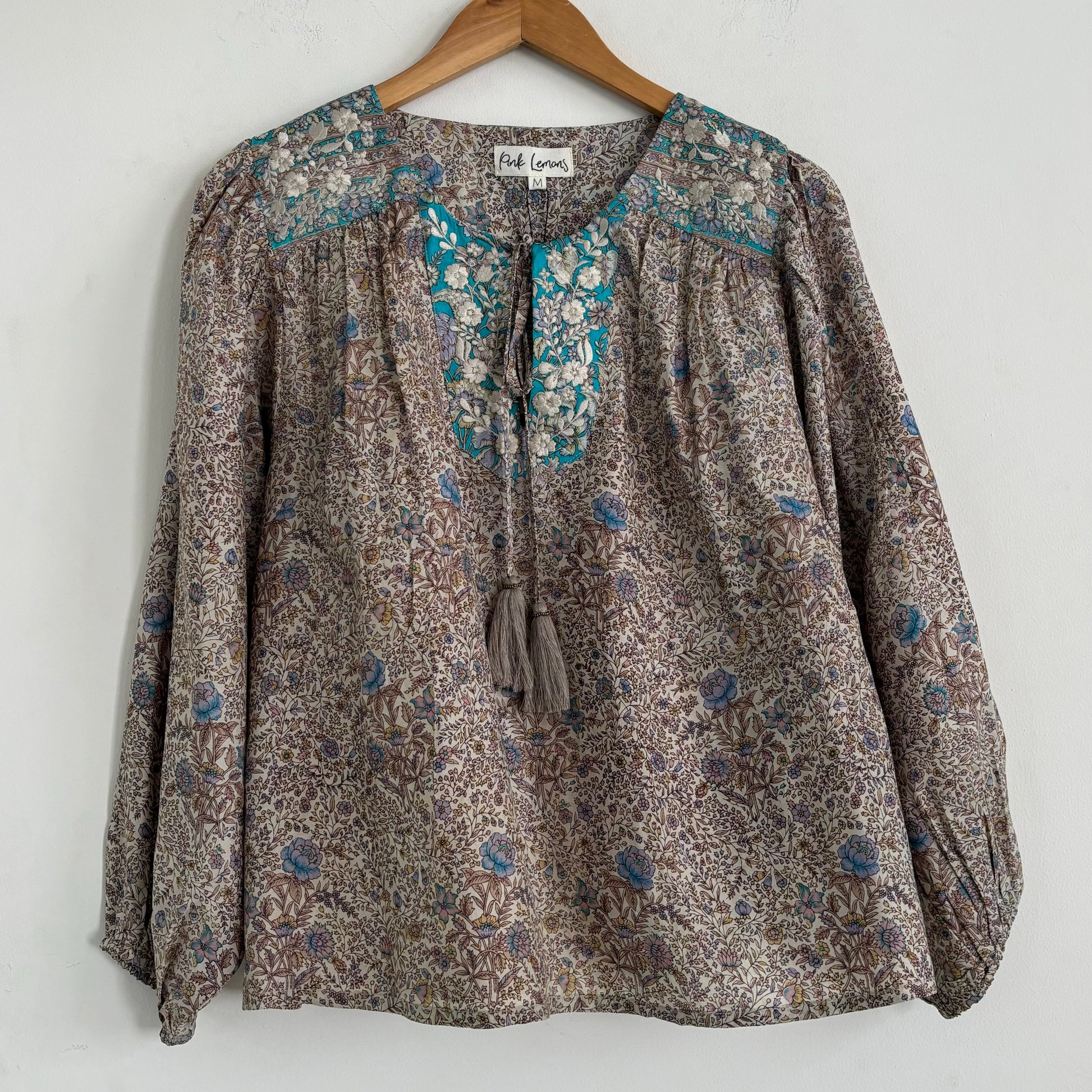 Lolita blouse has a loose breezy, feminine shape with puff shoulder detail and a front yoke with tassel ties. Lolita exudes charm and elegance with pretty embroidery detail on the shoulders and front yoke ,she looks great with jeans , linen pants and skirts /shorts alike , she can be dressed up or down to suit the occasion. It has a swing shape that can be worn loose or tucked in . Super versatile .