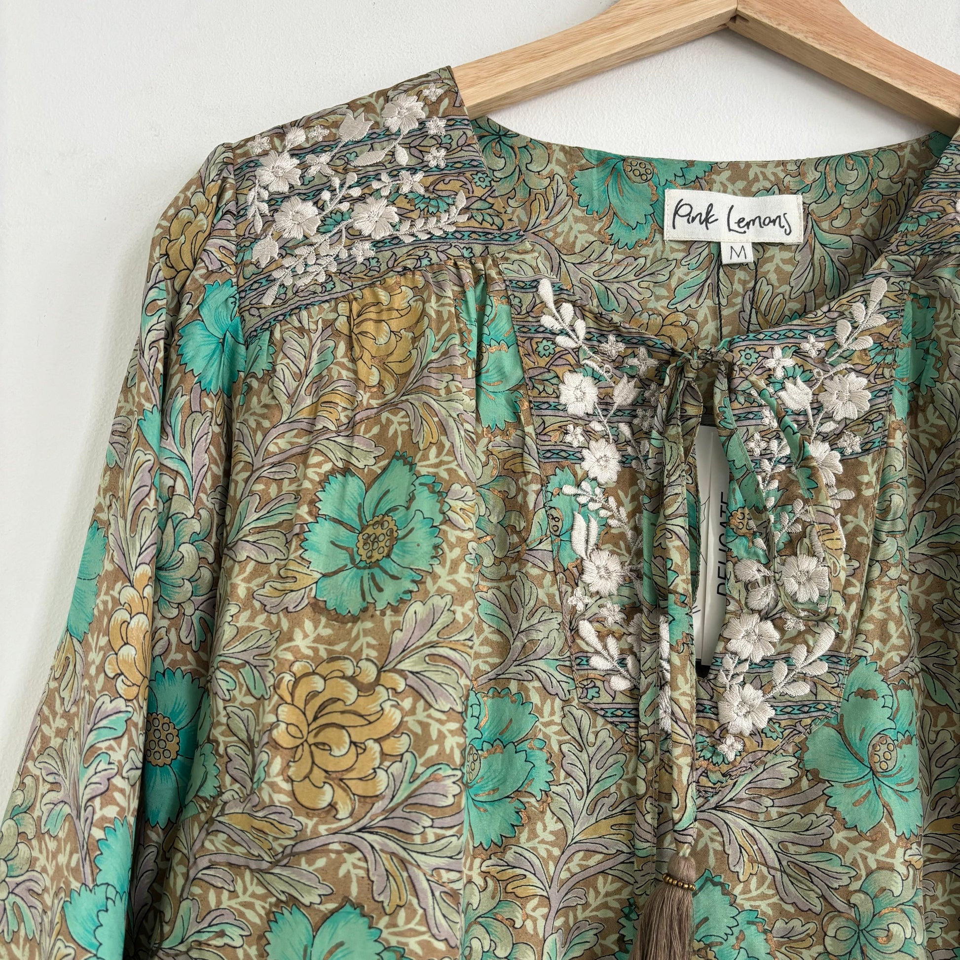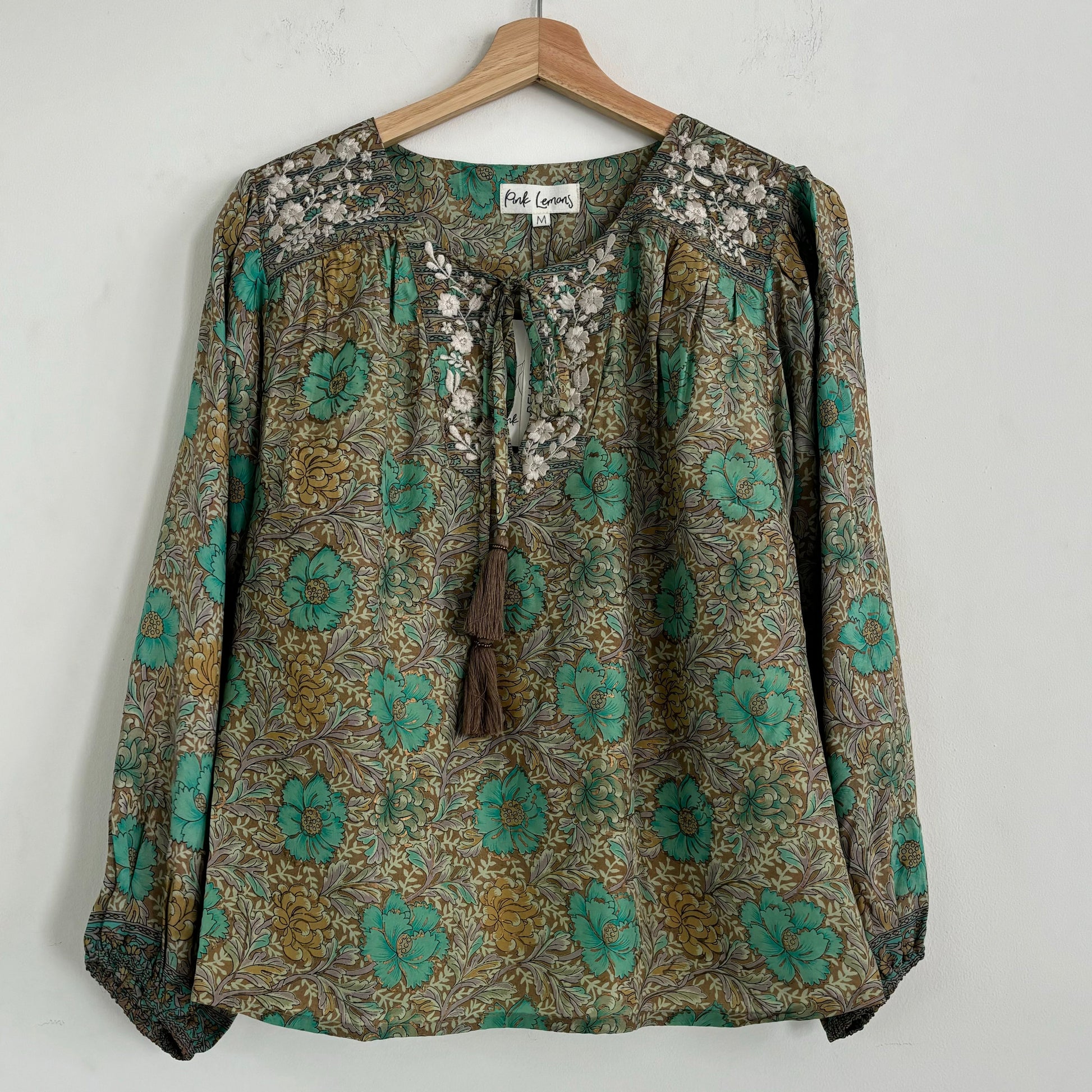 Lolita blouse has a loose breezy, feminine shape with puff shoulder detail and a front yoke with tassel ties. Lolita exudes charm and elegance with pretty embroidery detail on the shoulders and front yoke ,she looks great with jeans , linen pants and skirts /shorts alike , she can be dressed up or down to suit the occasion. It has a swing shape that can be worn loose or tucked in . Super versatile .