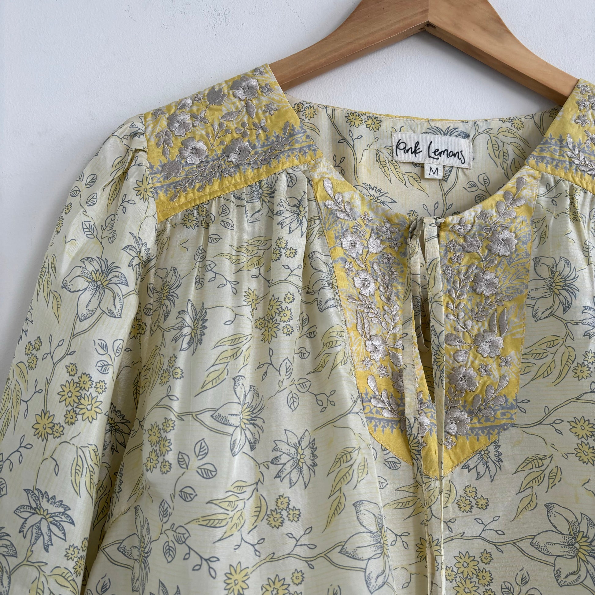 Lolita blouse has a loose breezy, feminine shape with puff shoulder detail and a front yoke with tassel ties. Lolita exudes charm and elegance with pretty embroidery detail on the shoulders and front yoke ,she looks great with jeans , linen pants and skirts /shorts alike , she can be dressed up or down to suit the occasion. It has a swing shape that can be worn loose or tucked in . Super versatile .