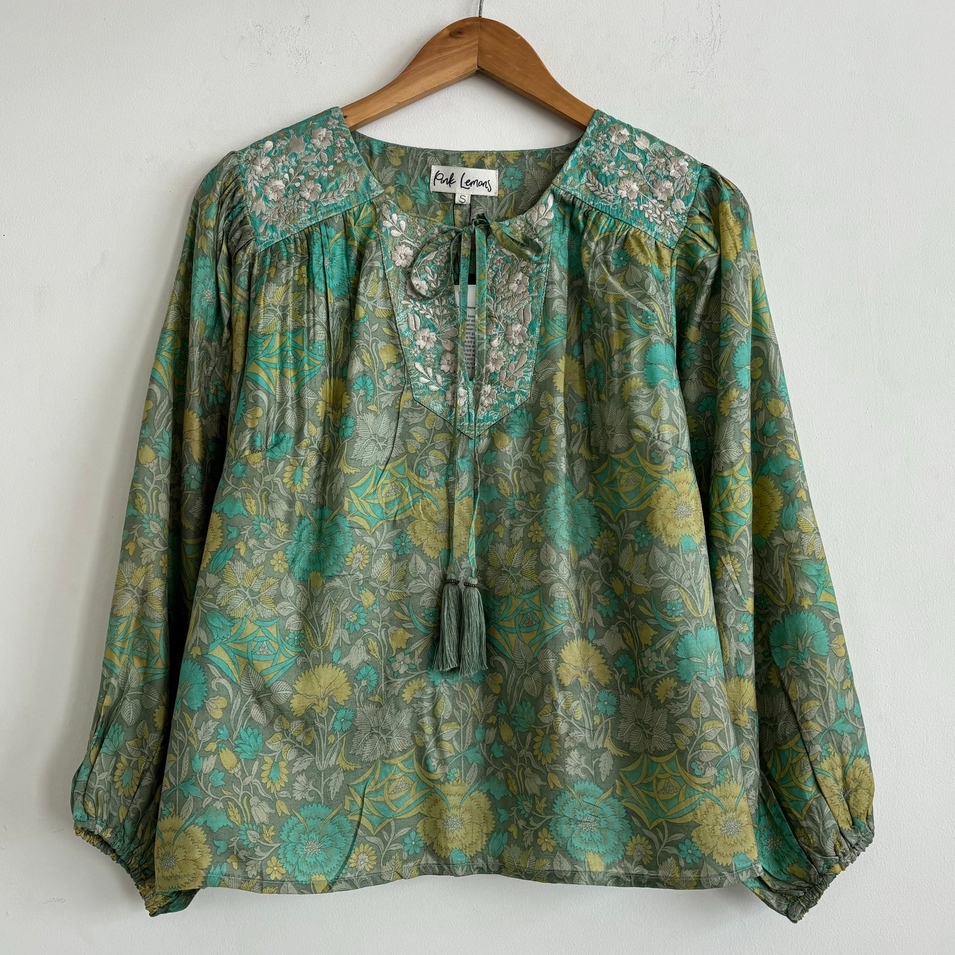 Lolita blouse has a loose breezy, feminine shape with puff shoulder detail and a front yoke with tassel ties. Lolita exudes charm and elegance with pretty embroidery detail on the shoulders and front yoke ,she looks great with jeans , linen pants and skirts /shorts alike , she can be dressed up or down to suit the occasion. It has a swing shape that can be worn loose or tucked in . Super versatile .
