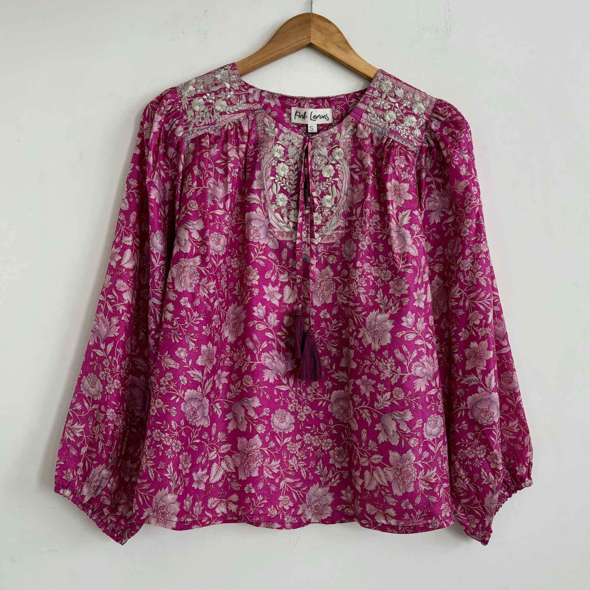 Lolita blouse has a loose breezy, feminine shape with puff shoulder detail and a front yoke with tassel ties. Lolita exudes charm and elegance with pretty embroidery detail on the shoulders and front yoke ,she looks great with jeans , linen pants and skirts /shorts alike , she can be dressed up or down to suit the occasion. It has a swing shape that can be worn loose or tucked in . Super versatile .