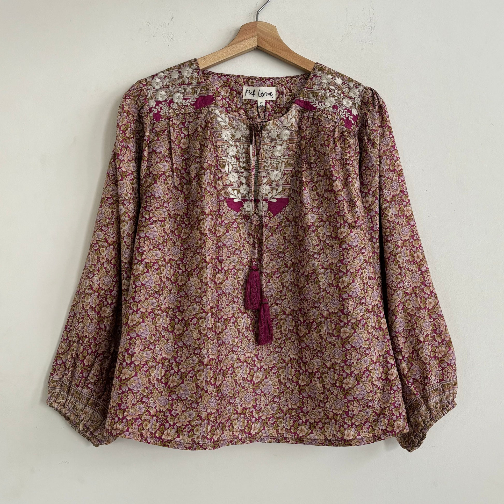 Lolita blouse has a loose breezy, feminine shape with puff shoulder detail and a front yoke with tassel ties. Lolita exudes charm and elegance with pretty embroidery detail on the shoulders and front yoke ,she looks great with jeans , linen pants and skirts /shorts alike , she can be dressed up or down to suit the occasion. It has a swing shape that can be worn loose or tucked in . Super versatile .