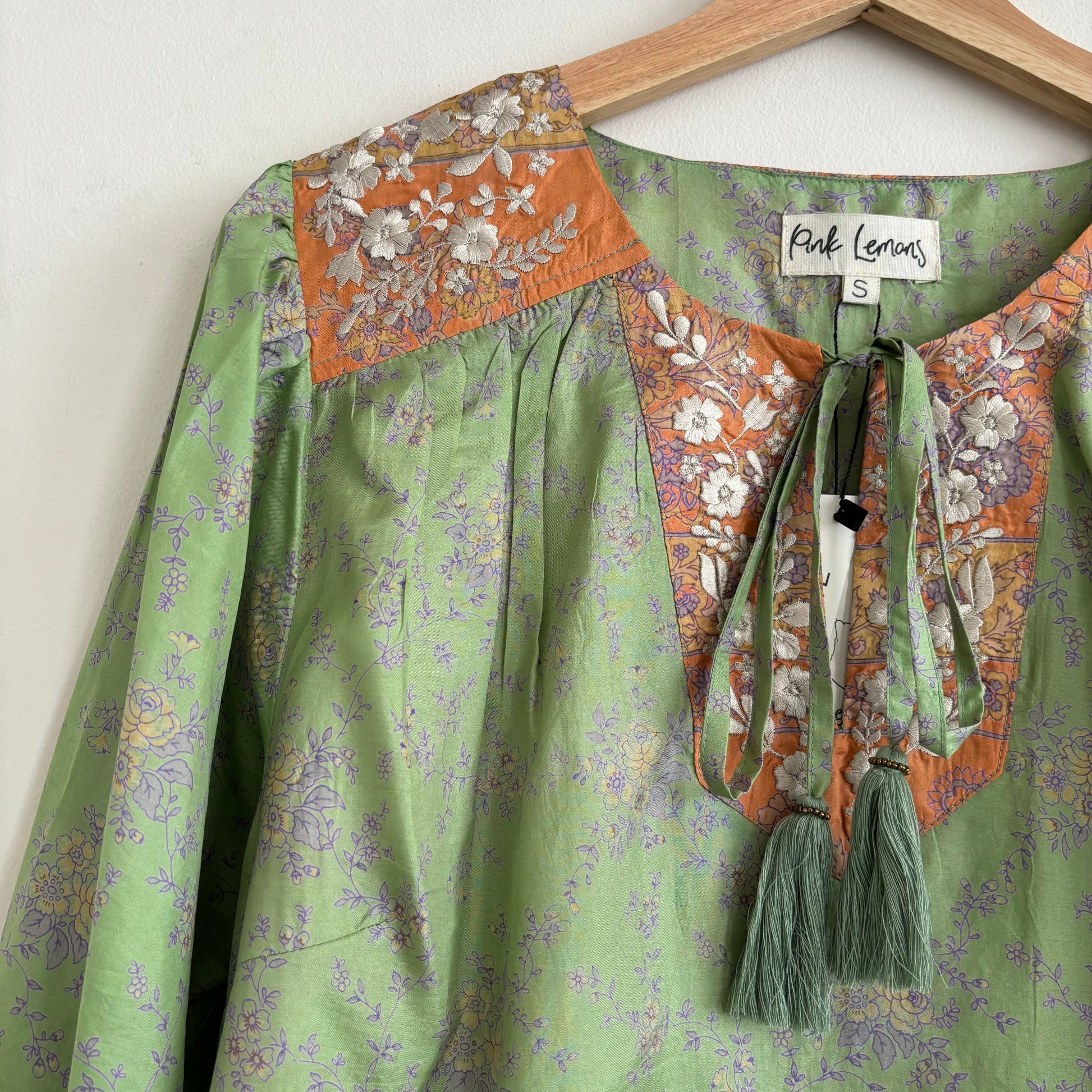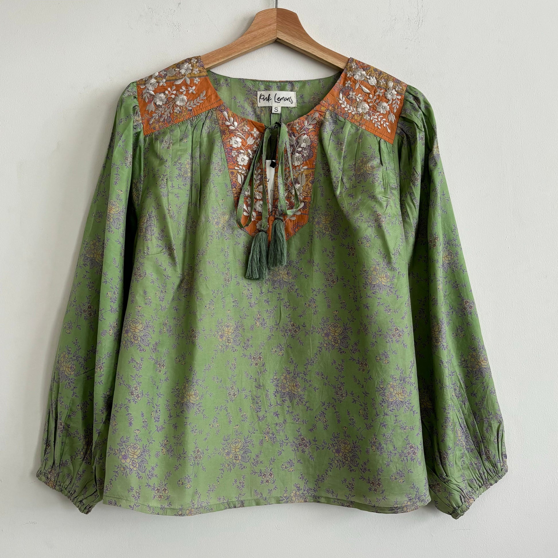 Lolita blouse has a loose breezy, feminine shape with puff shoulder detail and a front yoke with tassel ties. Lolita exudes charm and elegance with pretty embroidery detail on the shoulders and front yoke ,she looks great with jeans , linen pants and skirts /shorts alike , she can be dressed up or down to suit the occasion. It has a swing shape that can be worn loose or tucked in . Super versatile .