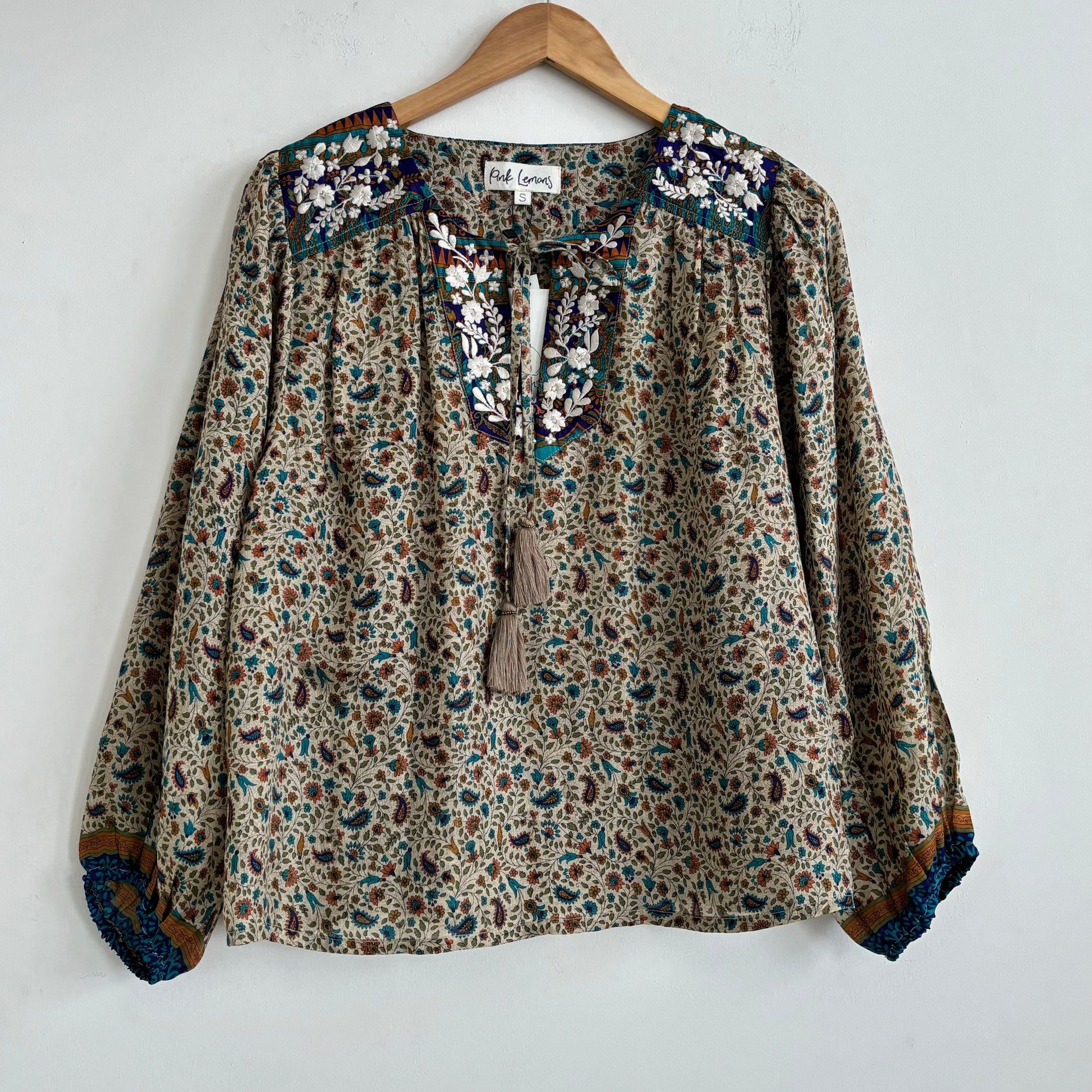Lolita blouse has a loose breezy, feminine shape with puff shoulder detail and a front yoke with tassel ties. Lolita exudes charm and elegance with pretty embroidery detail on the shoulders and front yoke ,she looks great with jeans , linen pants and skirts /shorts alike , she can be dressed up or down to suit the occasion. It has a swing shape that can be worn loose or tucked in . Super versatile .