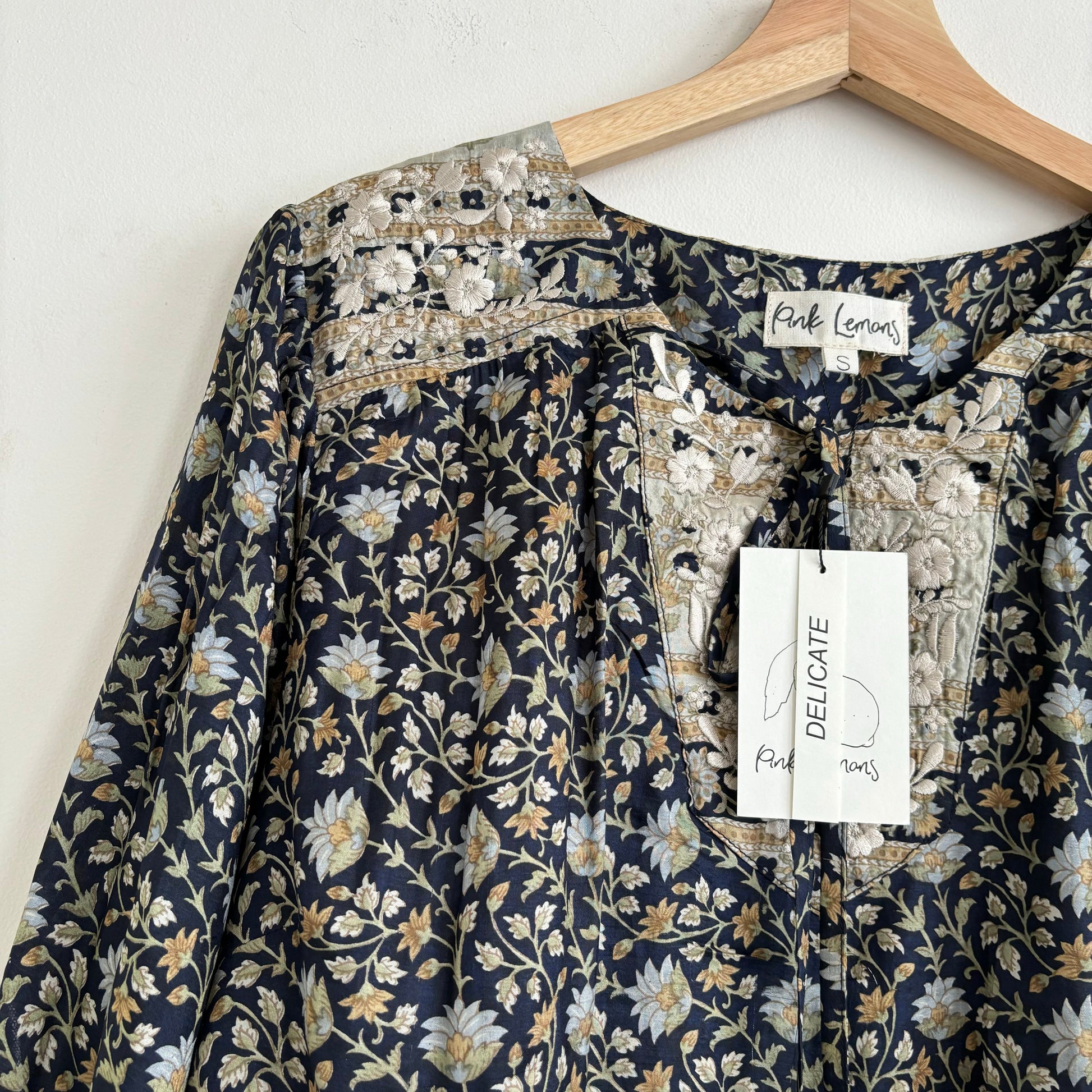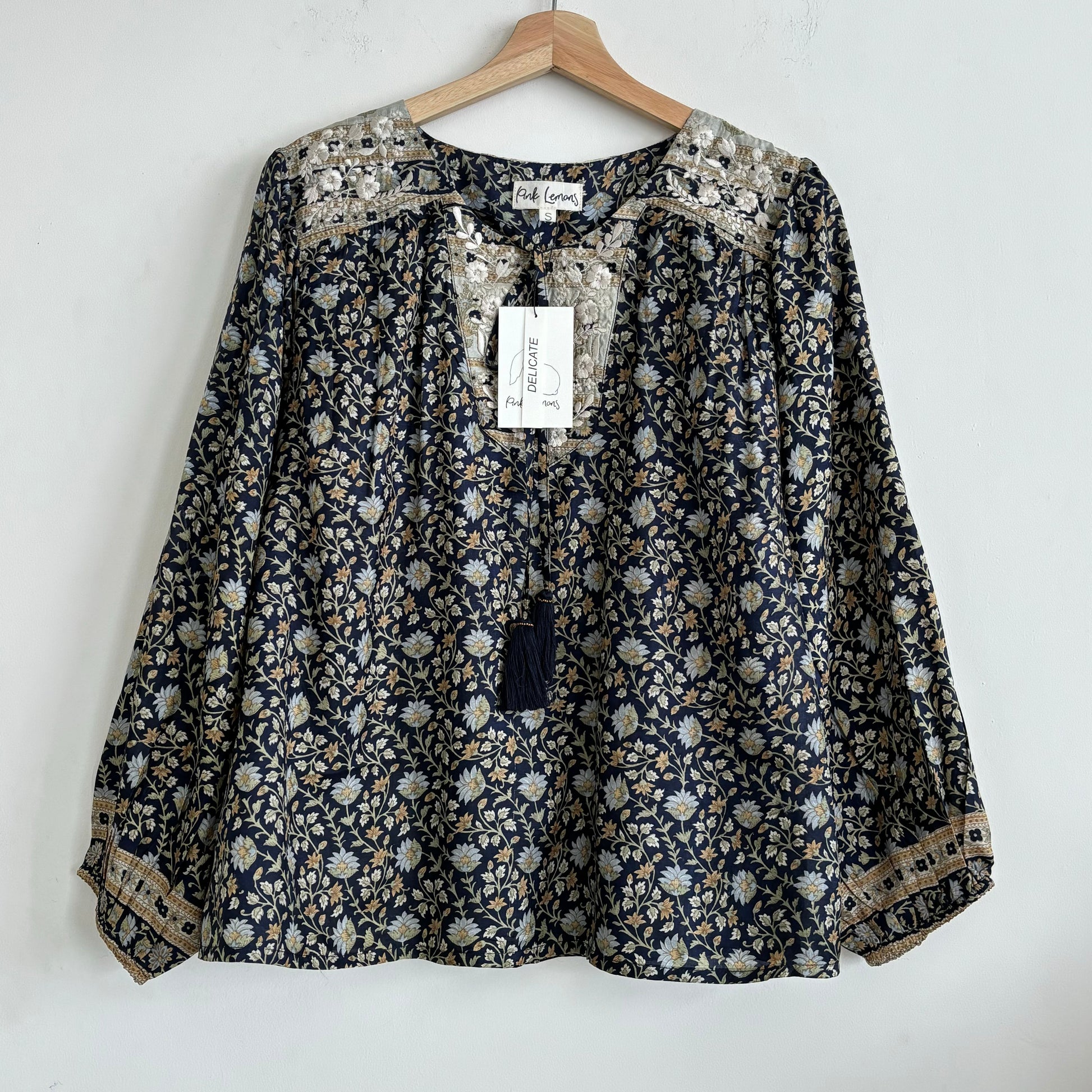 Lolita blouse has a loose breezy, feminine shape with puff shoulder detail and a front yoke with tassel ties. Lolita exudes charm and elegance with pretty embroidery detail on the shoulders and front yoke ,she looks great with jeans , linen pants and skirts /shorts alike , she can be dressed up or down to suit the occasion. It has a swing shape that can be worn loose or tucked in . Super versatile .