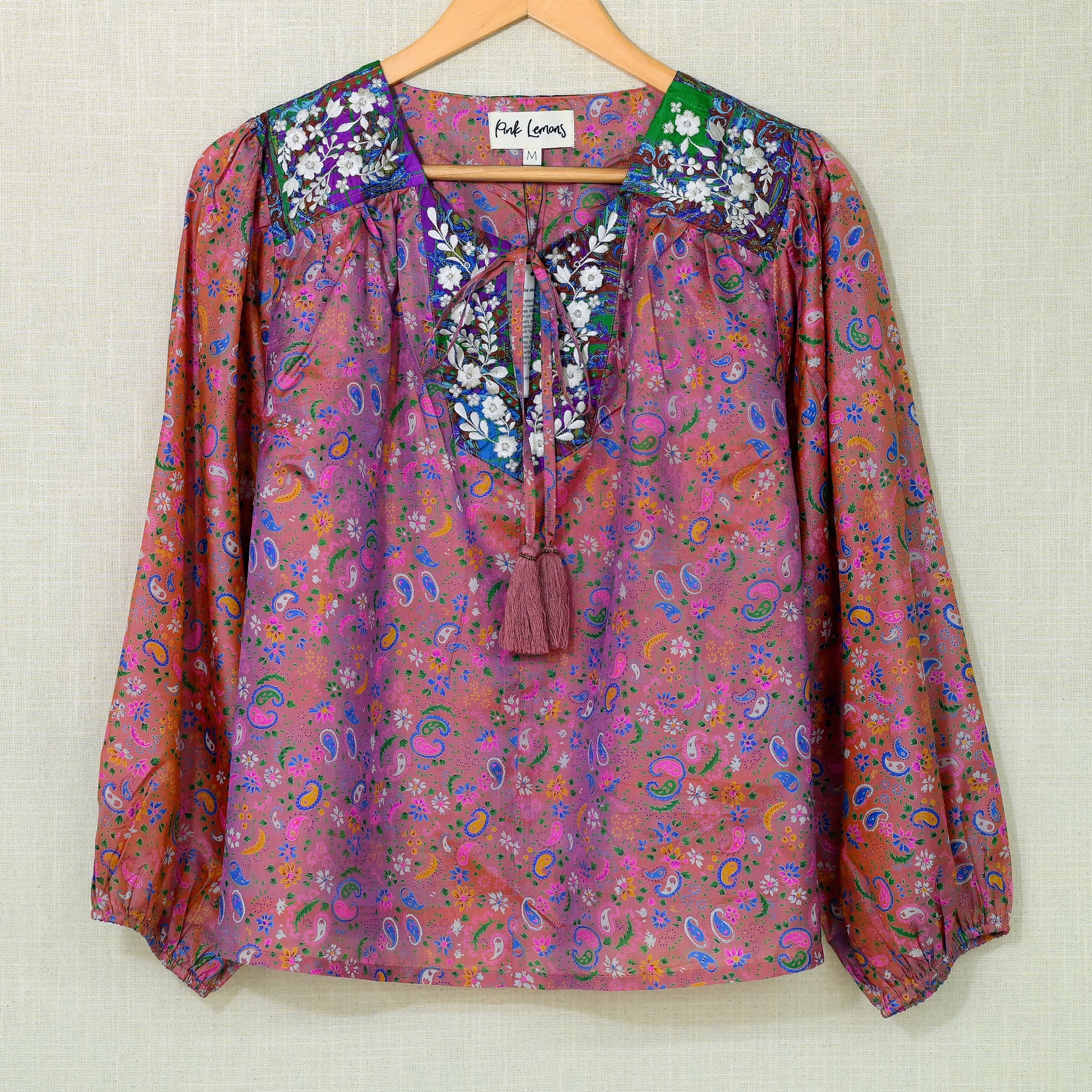 Lolita blouse has a loose breezy, feminine shape with puff shoulder detail and a front yoke with tassel ties. Lolita exudes charm and elegance with pretty embroidery detail on the shoulders and front yoke ,she looks great with jeans , linen pants and skirts /shorts alike , she can be dressed up or down to suit the occasion. It has a swing shape that can be worn loose or tucked in . Super versatile .