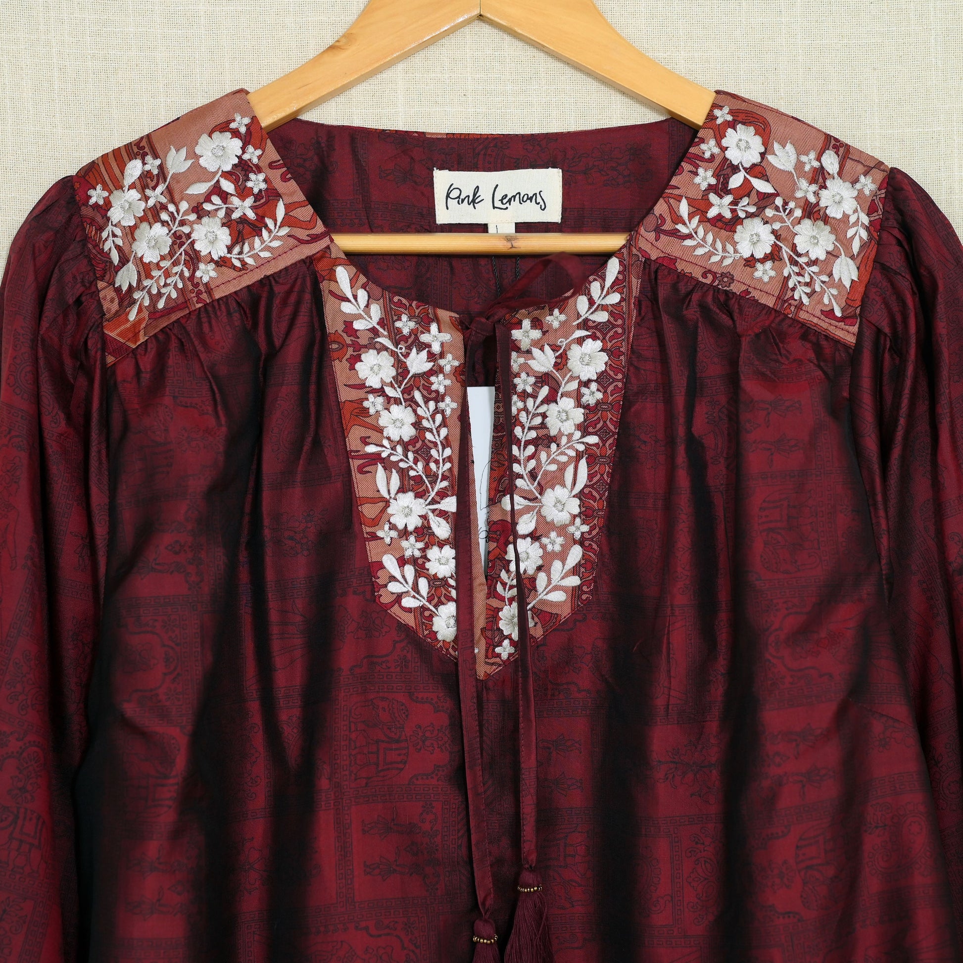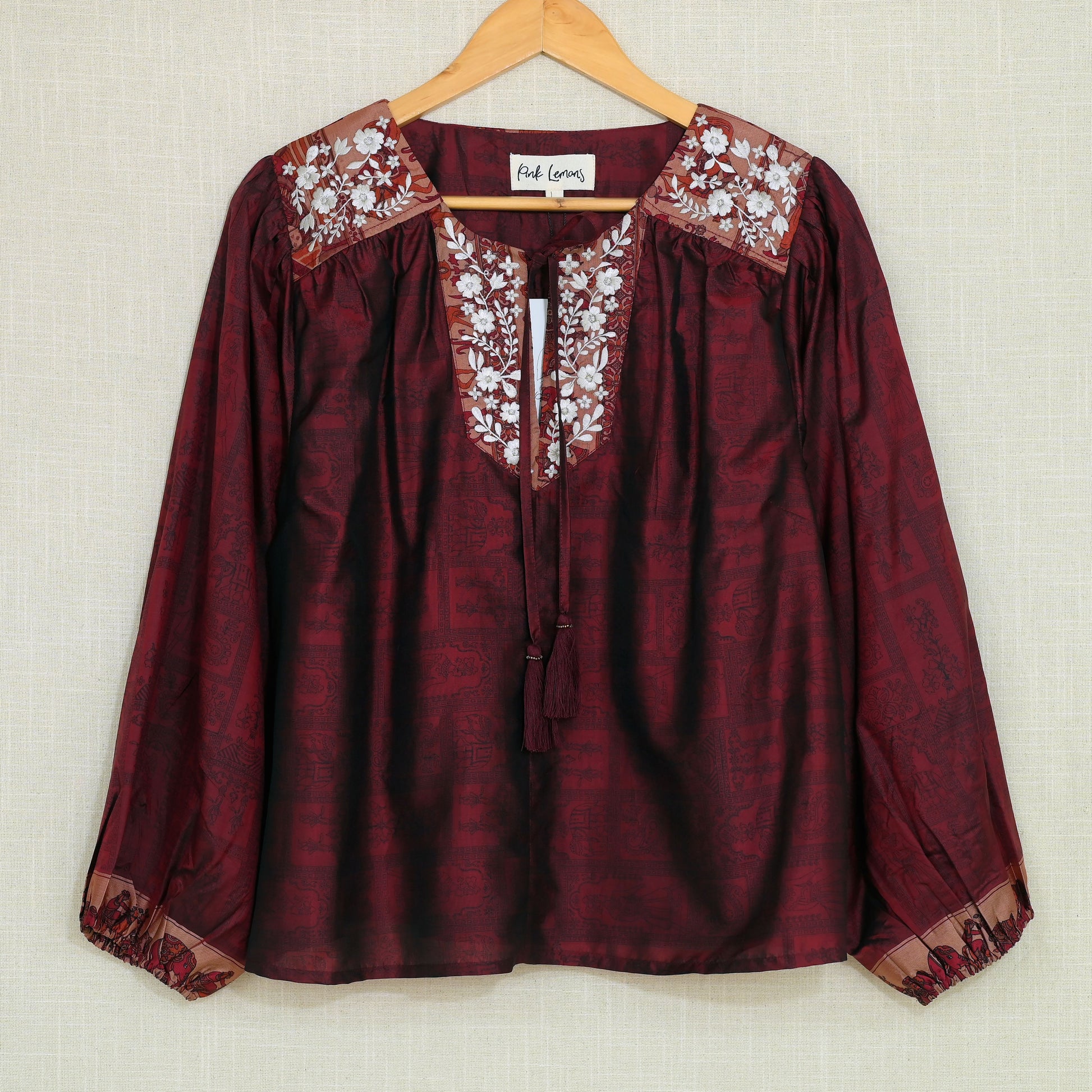 Lolita blouse has a loose breezy, feminine shape with puff shoulder detail and a front yoke with tassel ties. Lolita exudes charm and elegance with pretty embroidery detail on the shoulders and front yoke ,she looks great with jeans , linen pants and skirts /shorts alike , she can be dressed up or down to suit the occasion. It has a swing shape that can be worn loose or tucked in . Super versatile .