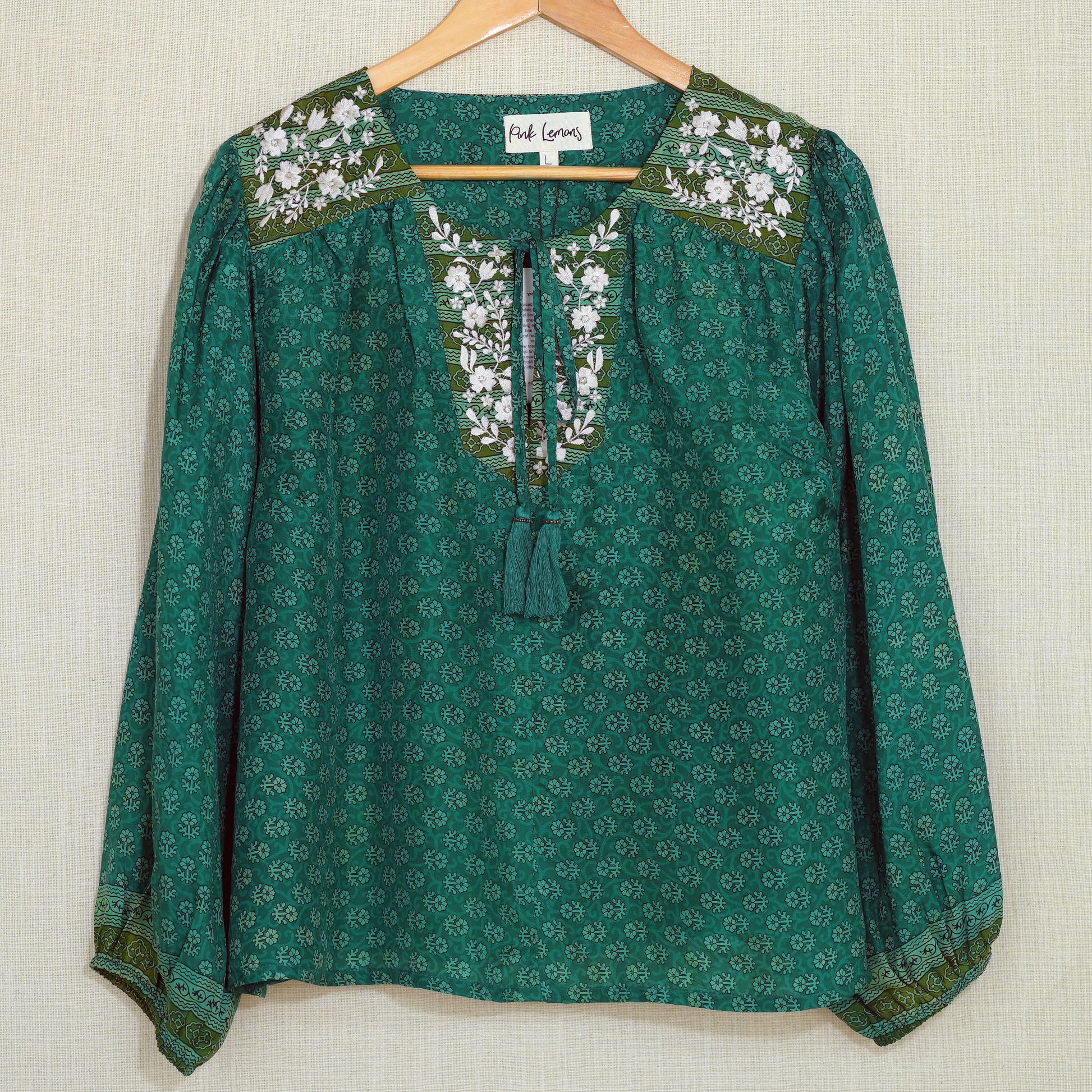 Lolita blouse has a loose breezy, feminine shape with puff shoulder detail and a front yoke with tassel ties. Lolita exudes charm and elegance with pretty embroidery detail on the shoulders and front yoke ,she looks great with jeans , linen pants and skirts /shorts alike , she can be dressed up or down to suit the occasion. It has a swing shape that can be worn loose or tucked in . Super versatile .