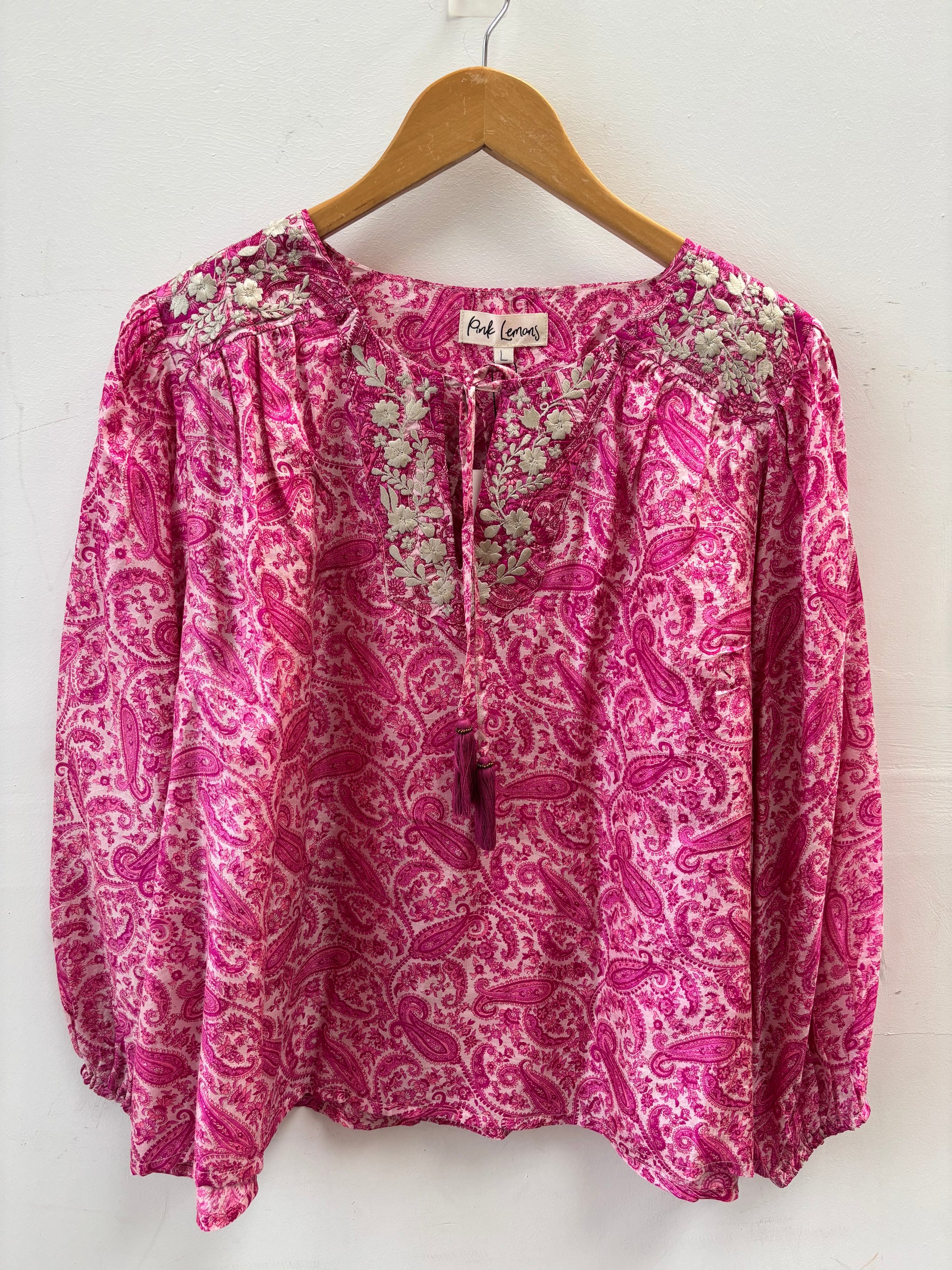 Lolita blouse has a loose breezy, feminine shape with puff shoulder detail and a front yoke with tassel ties. Lolita exudes charm and elegance with pretty embroidery detail on the shoulders and front yoke ,she looks great with jeans , linen pants and skirts /shorts alike , she can be dressed up or down to suit the occasion. It has a swing shape that can be worn loose or tucked in . Super versatile .