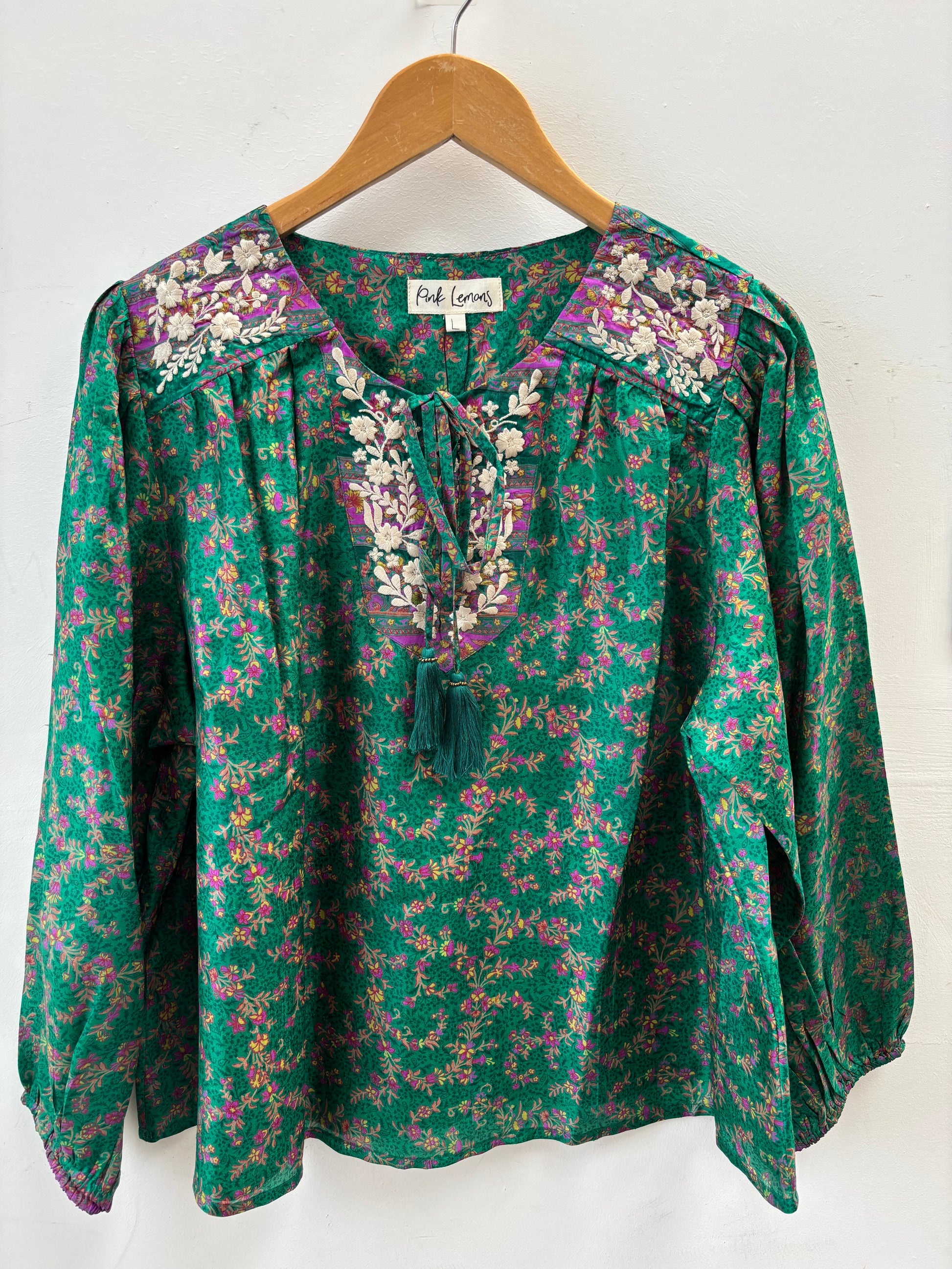Lolita blouse has a loose breezy, feminine shape with puff shoulder detail and a front yoke with tassel ties. Lolita exudes charm and elegance with pretty embroidery detail on the shoulders and front yoke ,she looks great with jeans , linen pants and skirts /shorts alike , she can be dressed up or down to suit the occasion. It has a swing shape that can be worn loose or tucked in . Super versatile .