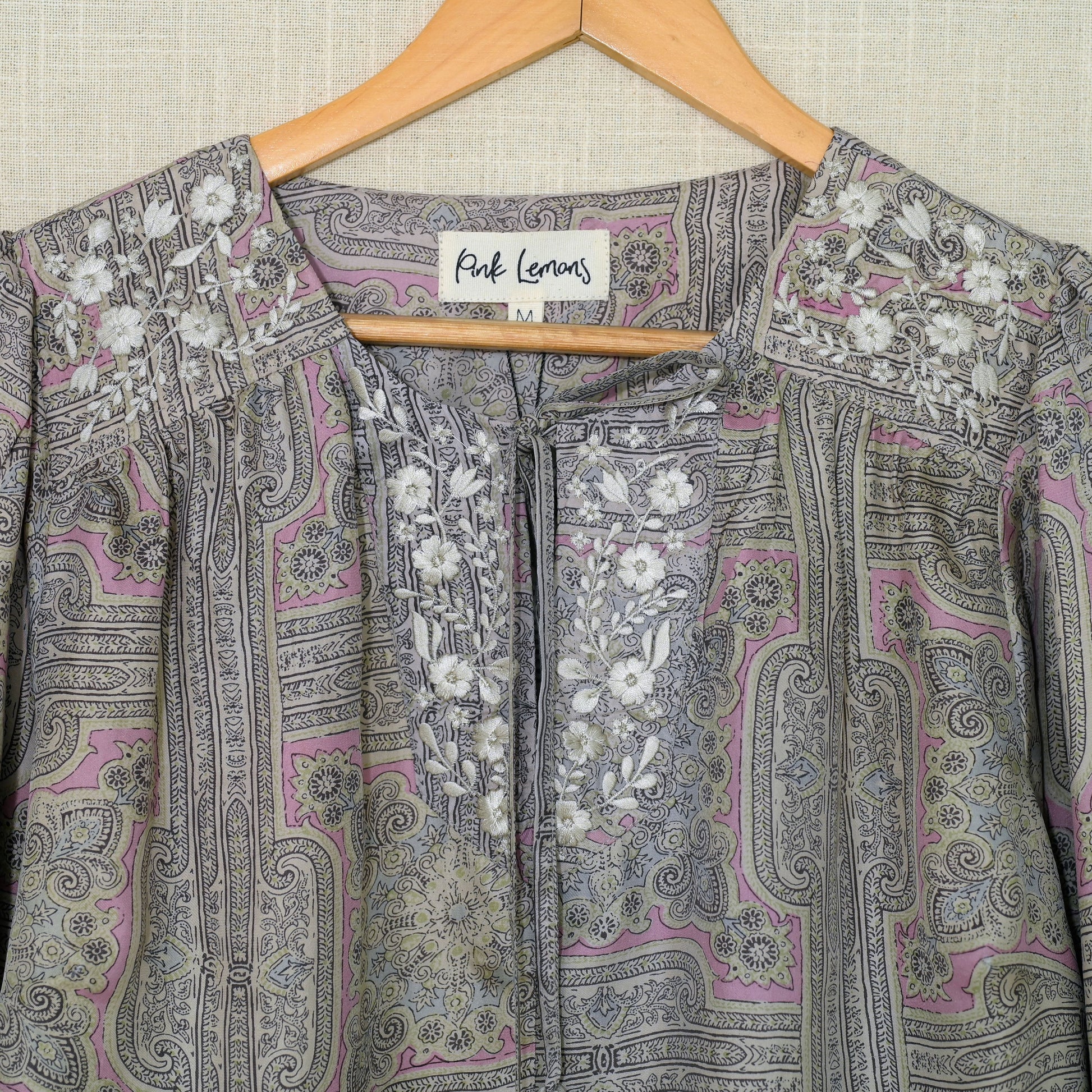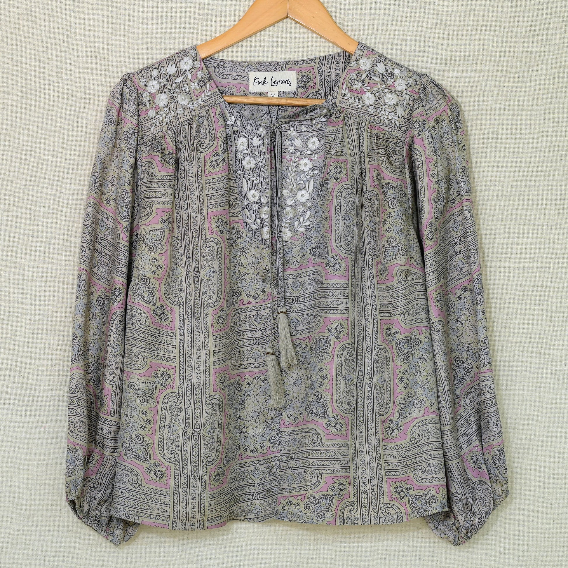 Lolita blouse has a loose breezy, feminine shape with puff shoulder detail and a front yoke with tassel ties. Lolita exudes charm and elegance with pretty embroidery detail on the shoulders and front yoke ,she looks great with jeans , linen pants and skirts /shorts alike , she can be dressed up or down to suit the occasion. It has a swing shape that can be worn loose or tucked in . Super versatile .
