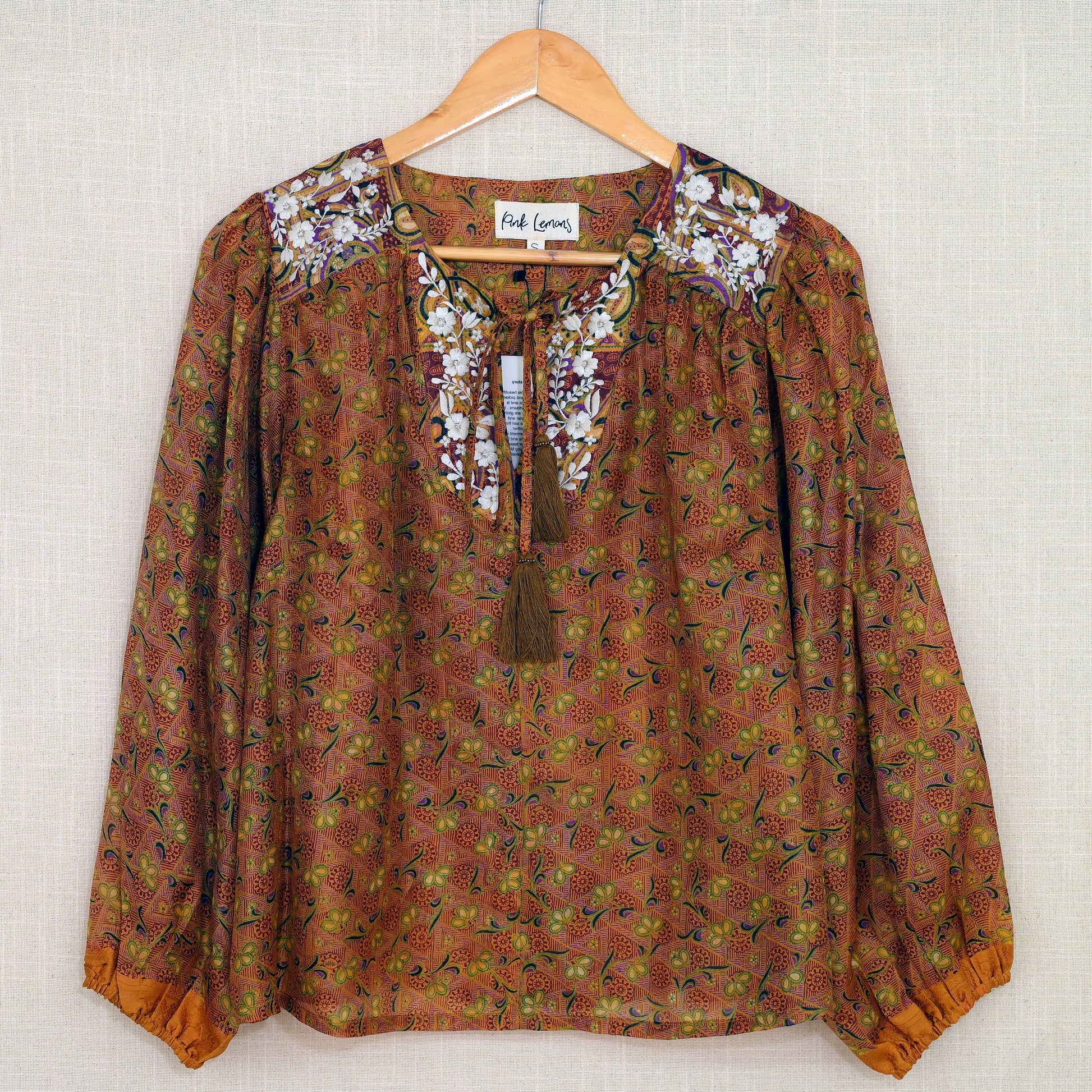 Lolita blouse has a loose breezy, feminine shape with puff shoulder detail and a front yoke with tassel ties. Lolita exudes charm and elegance with pretty embroidery detail on the shoulders and front yoke ,she looks great with jeans , linen pants and skirts /shorts alike , she can be dressed up or down to suit the occasion. It has a swing shape that can be worn loose or tucked in . Super versatile .