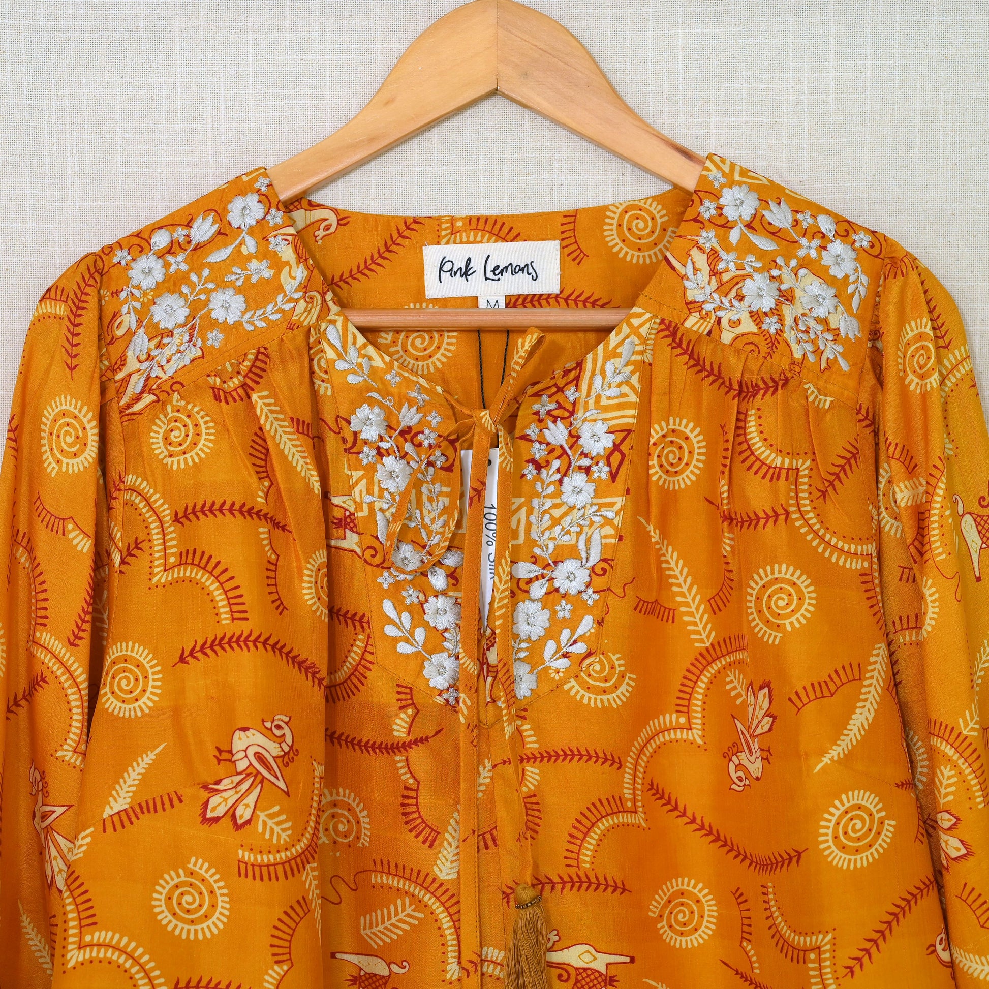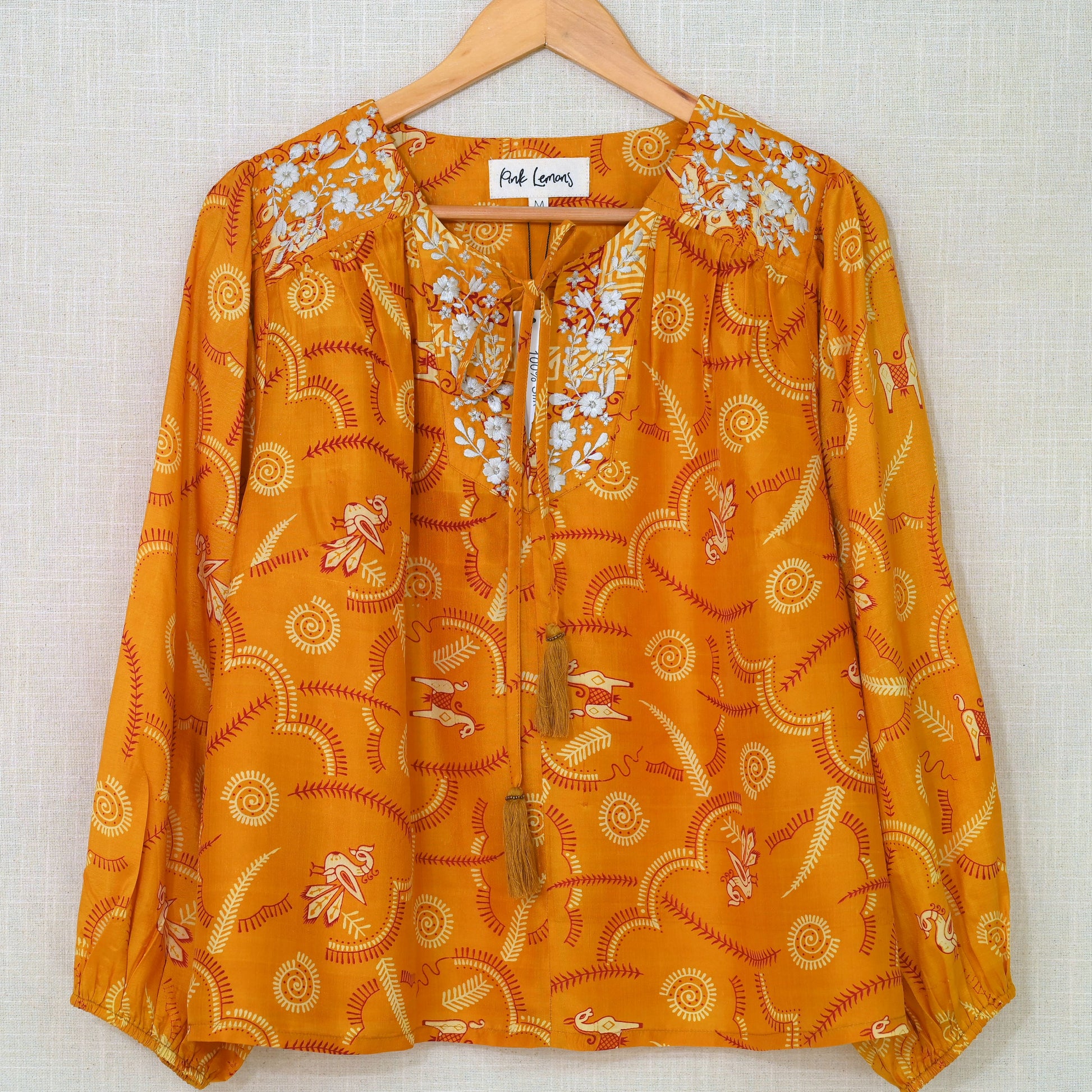 Lolita blouse has a loose breezy, feminine shape with puff shoulder detail and a front yoke with tassel ties. Lolita exudes charm and elegance with pretty embroidery detail on the shoulders and front yoke ,she looks great with jeans , linen pants and skirts /shorts alike , she can be dressed up or down to suit the occasion. It has a swing shape that can be worn loose or tucked in . Super versatile .