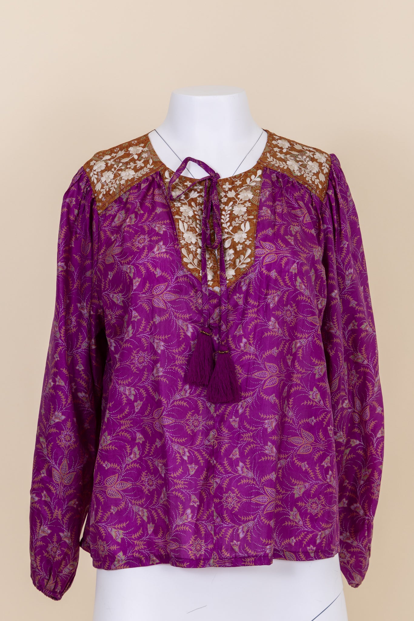 Lolita blouse has a loose breezy, feminine shape with puff shoulder detail and a front yoke with tassel ties. Lolita exudes charm and elegance with pretty embroidery detail on the shoulders and front yoke ,she looks great with jeans , linen pants and skirts /shorts alike , she can be dressed up or down to suit the occasion. It has a swing shape that can be worn loose or tucked in . Super versatile .