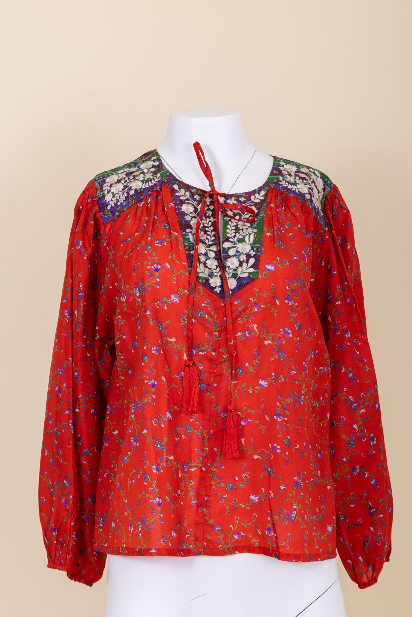 Lolita blouse has a loose breezy, feminine shape with puff shoulder detail and a front yoke with tassel ties. Lolita exudes charm and elegance with pretty embroidery detail on the shoulders and front yoke ,she looks great with jeans , linen pants and skirts /shorts alike , she can be dressed up or down to suit the occasion. It has a swing shape that can be worn loose or tucked in . Super versatile .