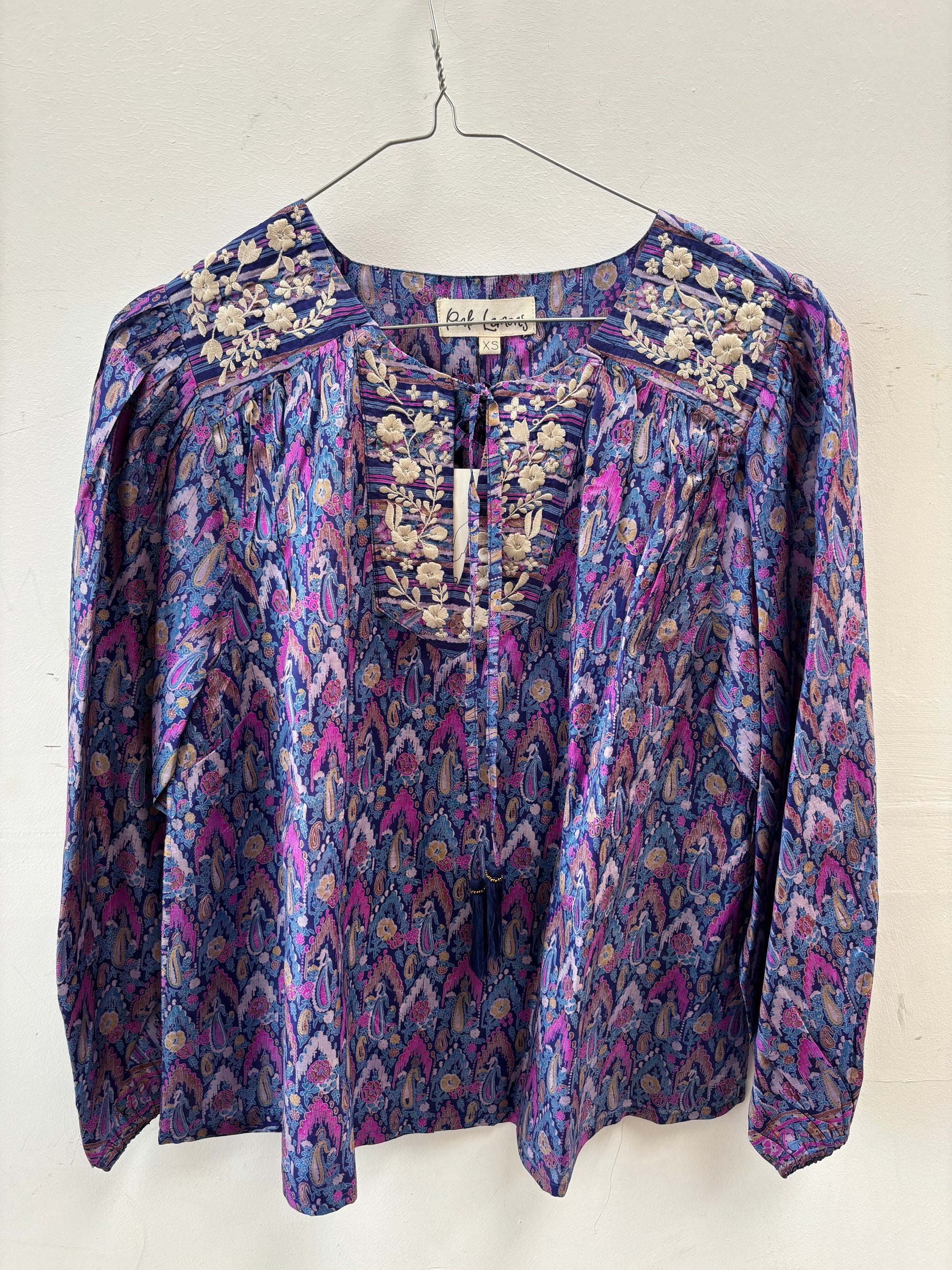 Lolita blouse has a loose breezy, feminine shape with puff shoulder detail and a front yoke with tassel ties. Lolita exudes charm and elegance with pretty embroidery detail on the shoulders and front yoke ,she looks great with jeans , linen pants and skirts /shorts alike , she can be dressed up or down to suit the occasion. It has a swing shape that can be worn loose or tucked in . Super versatile .
