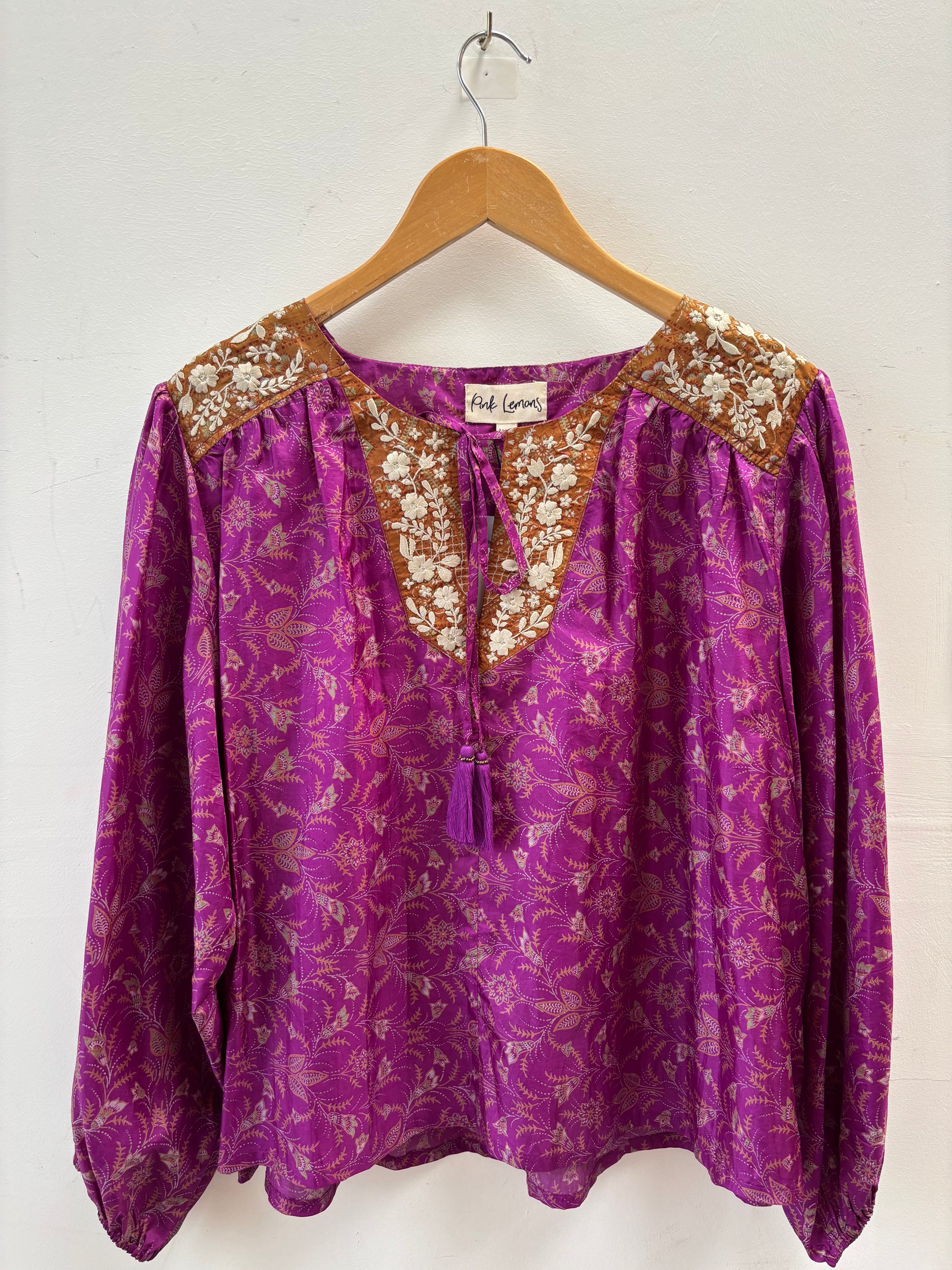 Lolita blouse has a loose breezy, feminine shape with puff shoulder detail and a front yoke with tassel ties. Lolita exudes charm and elegance with pretty embroidery detail on the shoulders and front yoke ,she looks great with jeans , linen pants and skirts /shorts alike , she can be dressed up or down to suit the occasion. It has a swing shape that can be worn loose or tucked in . Super versatile .