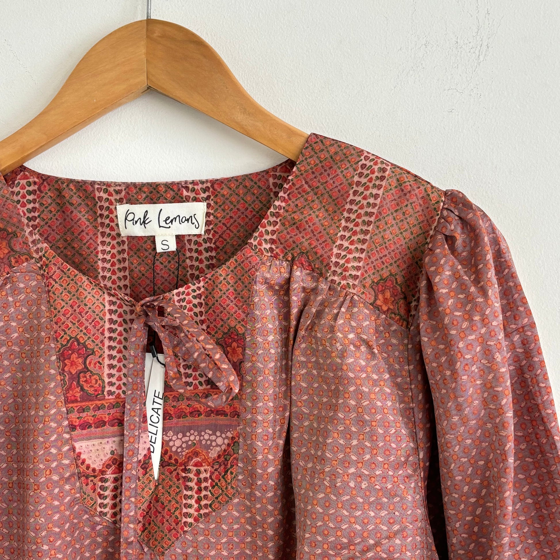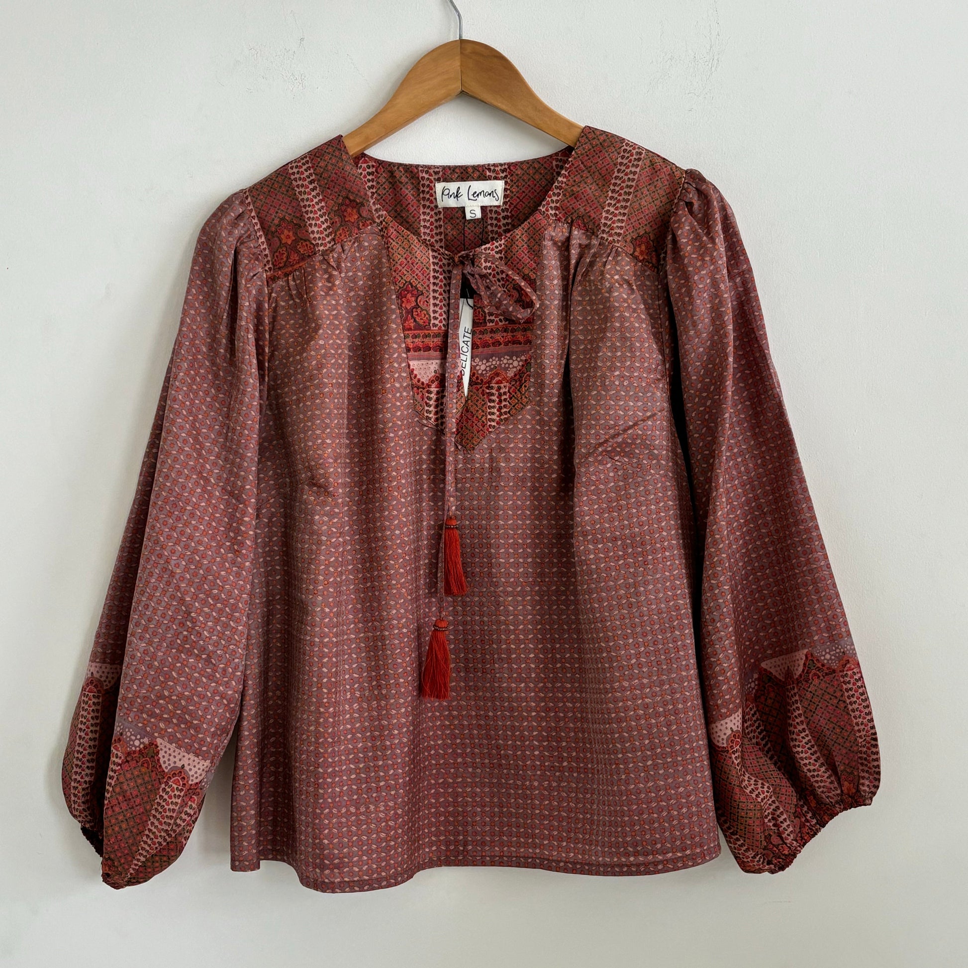Lolita blouse has a loose breezy, feminine shape with puff shoulder detail and a front yoke with tassel ties. Lolita exudes charm and elegance with pretty details on the shoulders and front yoke ,she looks great with jeans , linen pants and skirts /shorts alike , she can be dressed up or down to suit the occasion. It has a swing shape that can be worn loose or tucked in . Super versatile .