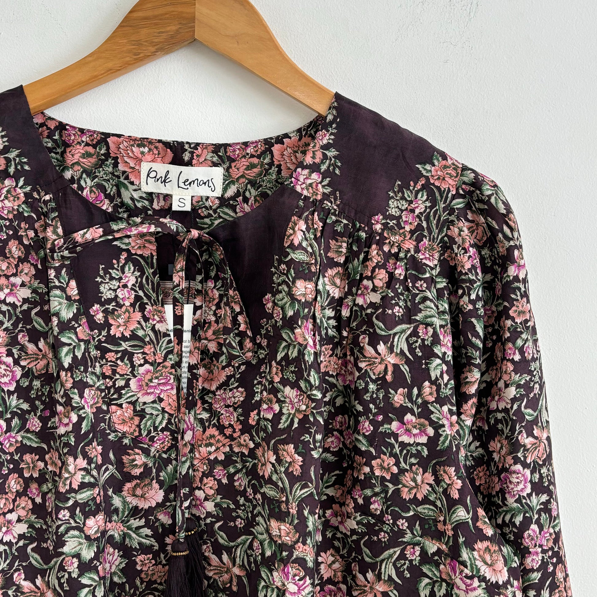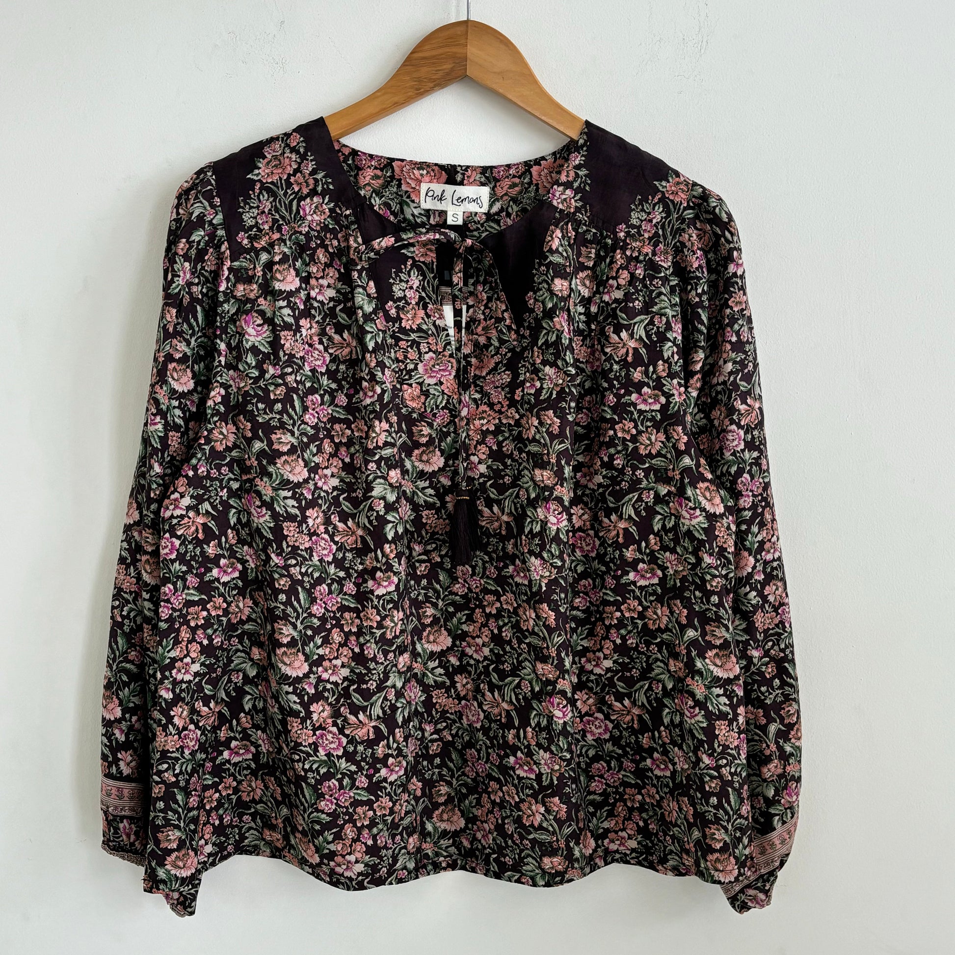 Lolita blouse has a loose breezy, feminine shape with puff shoulder detail and a front yoke with tassel ties. Lolita exudes charm and elegance with pretty details on the shoulders and front yoke ,she looks great with jeans , linen pants and skirts /shorts alike , she can be dressed up or down to suit the occasion. It has a swing shape that can be worn loose or tucked in . Super versatile .