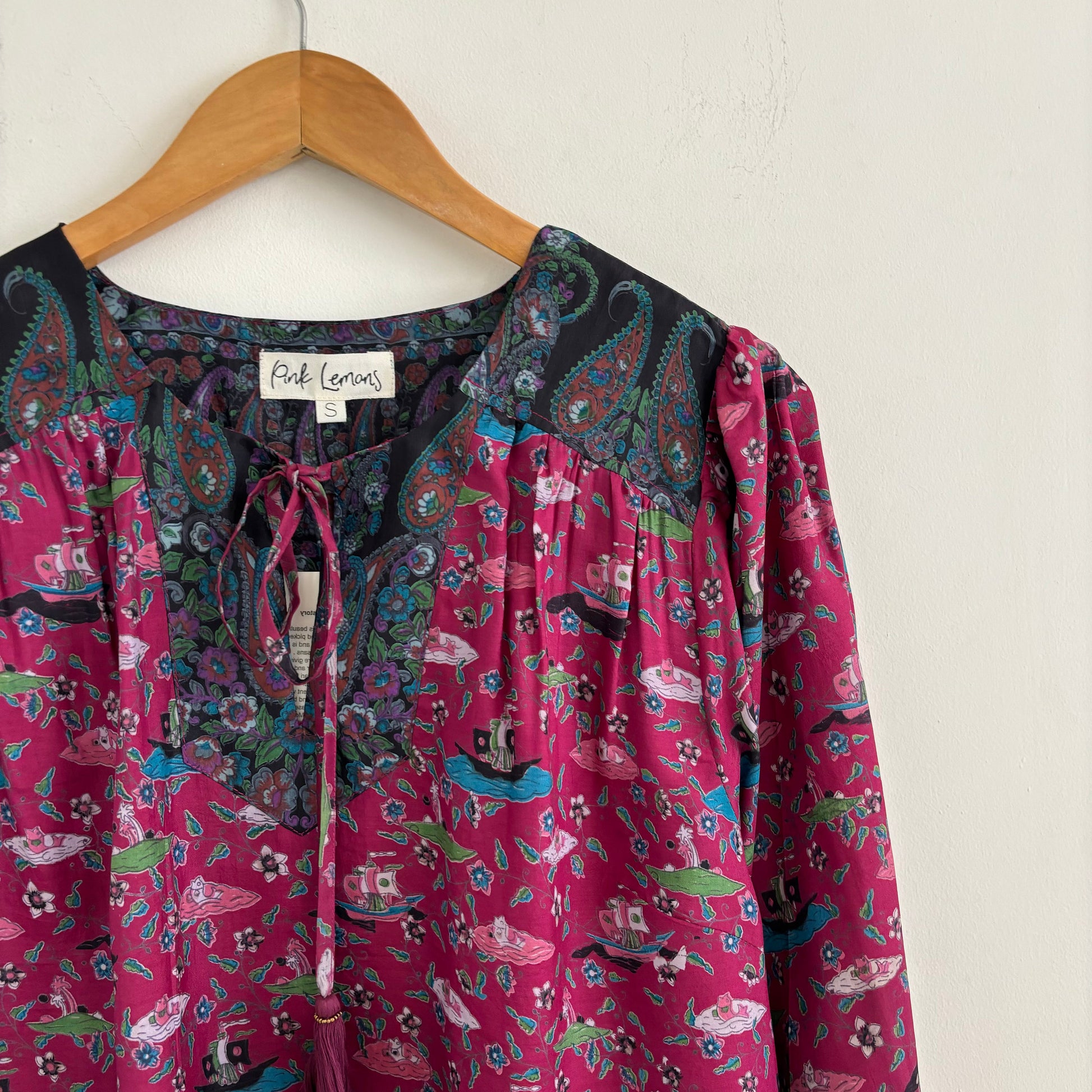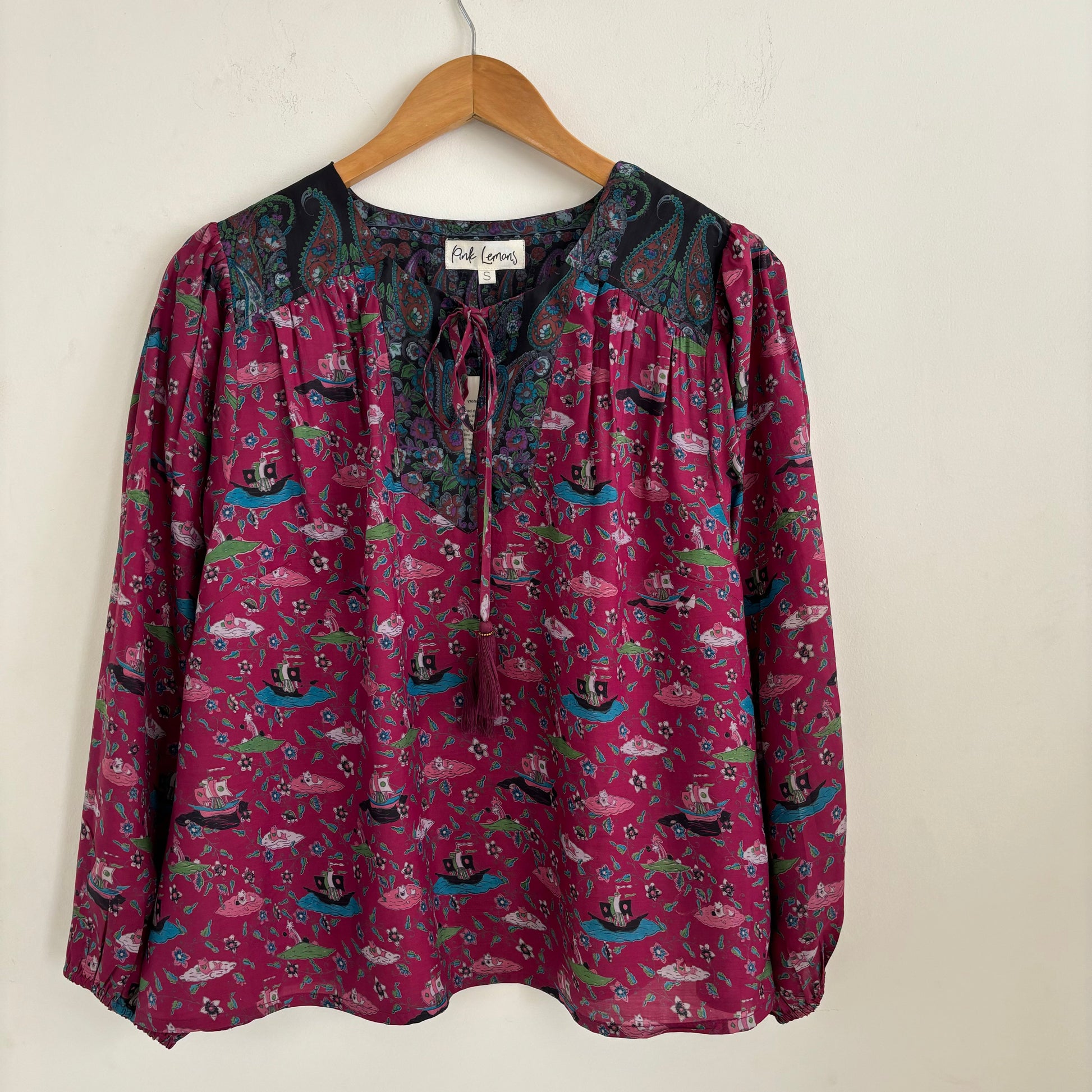Lolita blouse has a loose breezy, feminine shape with puff shoulder detail and a front yoke with tassel ties. Lolita exudes charm and elegance with pretty details on the shoulders and front yoke ,she looks great with jeans , linen pants and skirts /shorts alike , she can be dressed up or down to suit the occasion. It has a swing shape that can be worn loose or tucked in . Super versatile .