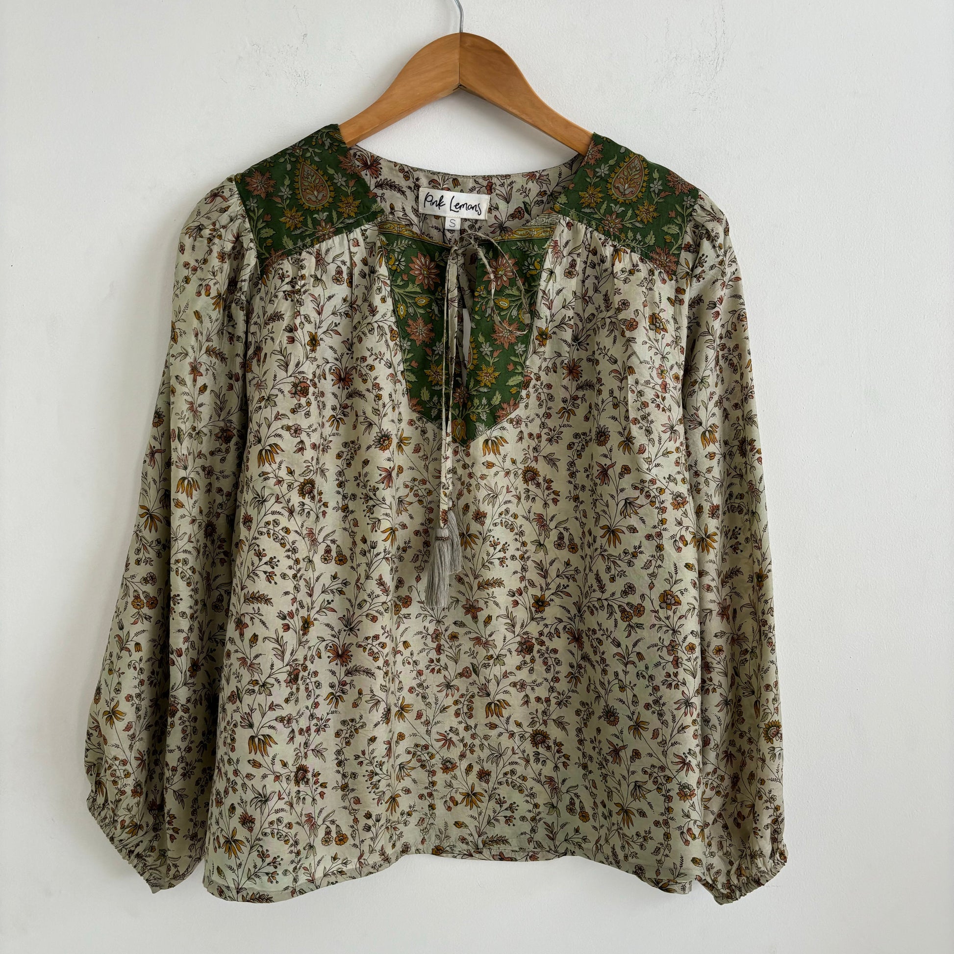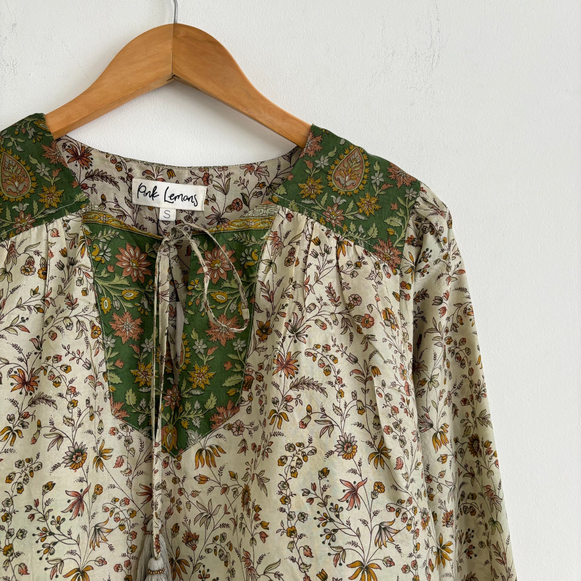 Lolita blouse has a loose breezy, feminine shape with puff shoulder detail and a front yoke with tassel ties. Lolita exudes charm and elegance with pretty details on the shoulders and front yoke ,she looks great with jeans , linen pants and skirts /shorts alike , she can be dressed up or down to suit the occasion. It has a swing shape that can be worn loose or tucked in . Super versatile .