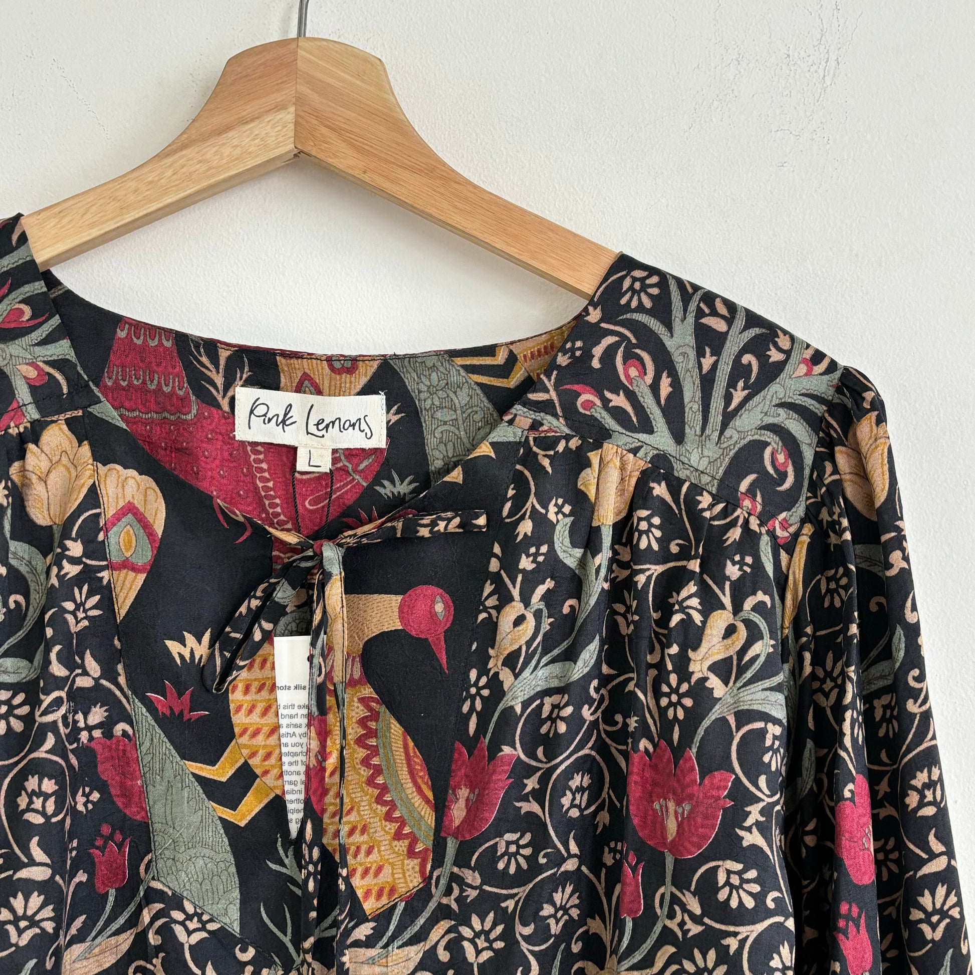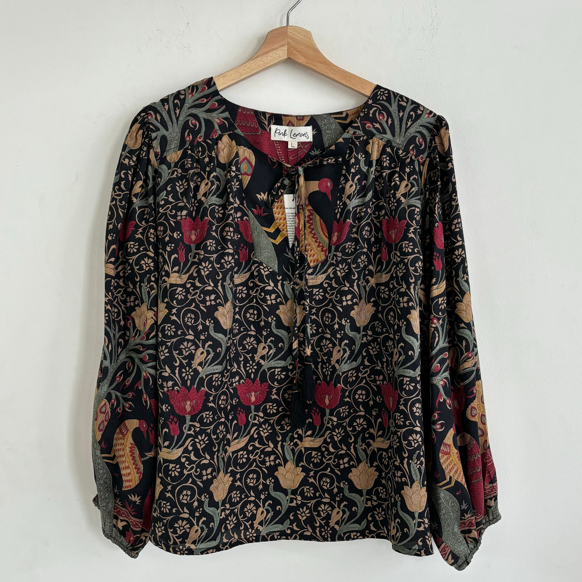 Lolita blouse has a loose breezy, feminine shape with puff shoulder detail and a front yoke with tassel ties. Lolita exudes charm and elegance with pretty details on the shoulders and front yoke ,she looks great with jeans , linen pants and skirts /shorts alike , she can be dressed up or down to suit the occasion. It has a swing shape that can be worn loose or tucked in . Super versatile .