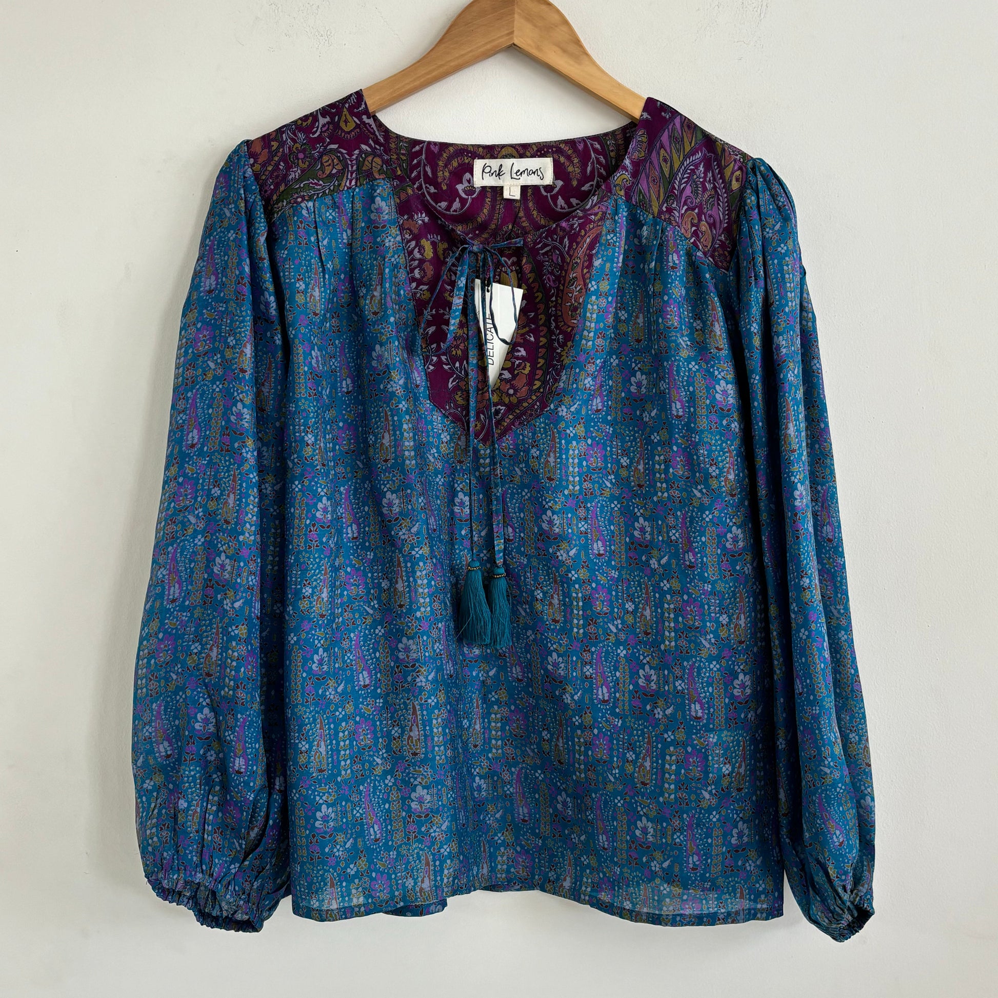 Lolita blouse has a loose breezy, feminine shape with puff shoulder detail and a front yoke with tassel ties. Lolita exudes charm and elegance with pretty details on the shoulders and front yoke ,she looks great with jeans , linen pants and skirts /shorts alike , she can be dressed up or down to suit the occasion. It has a swing shape that can be worn loose or tucked in . Super versatile .