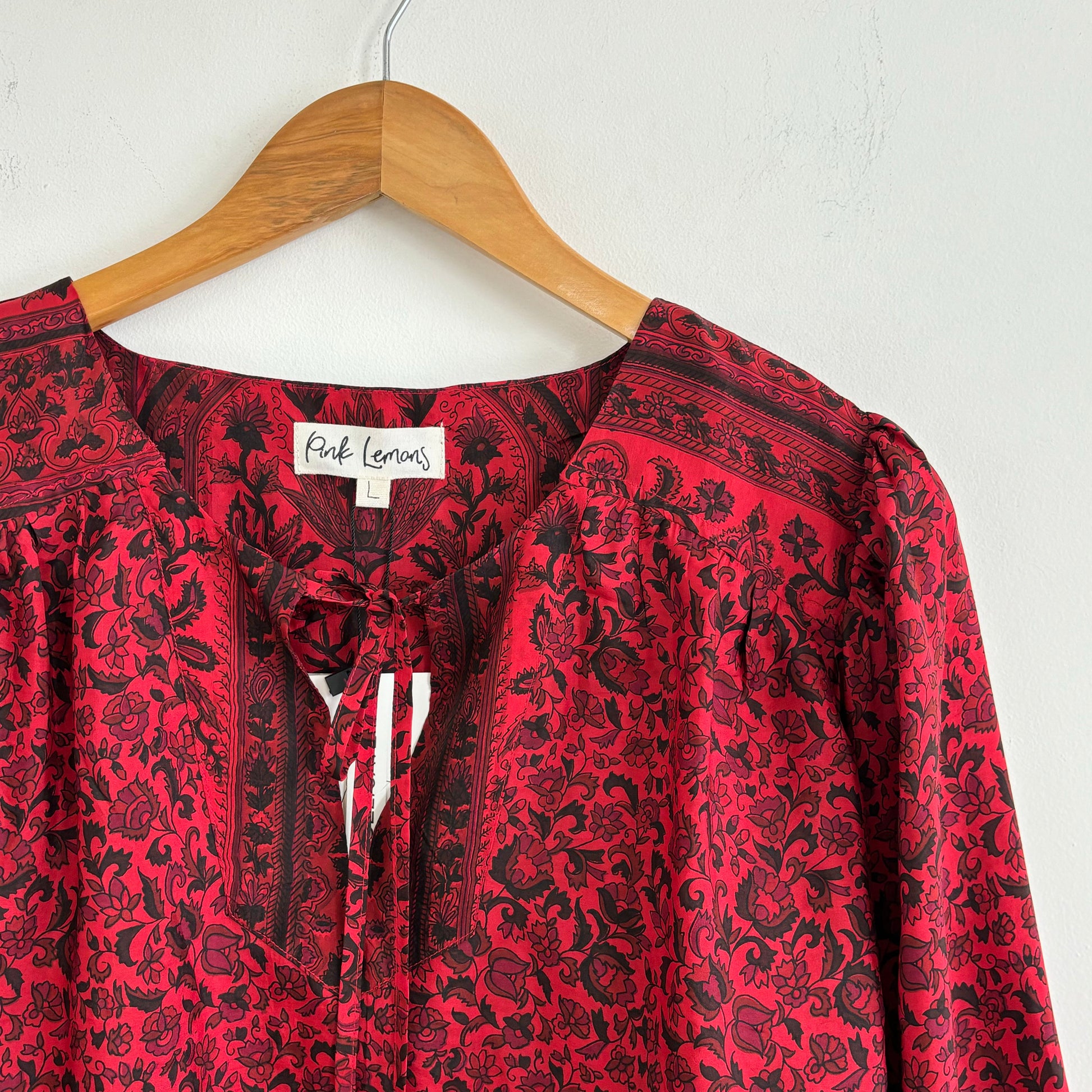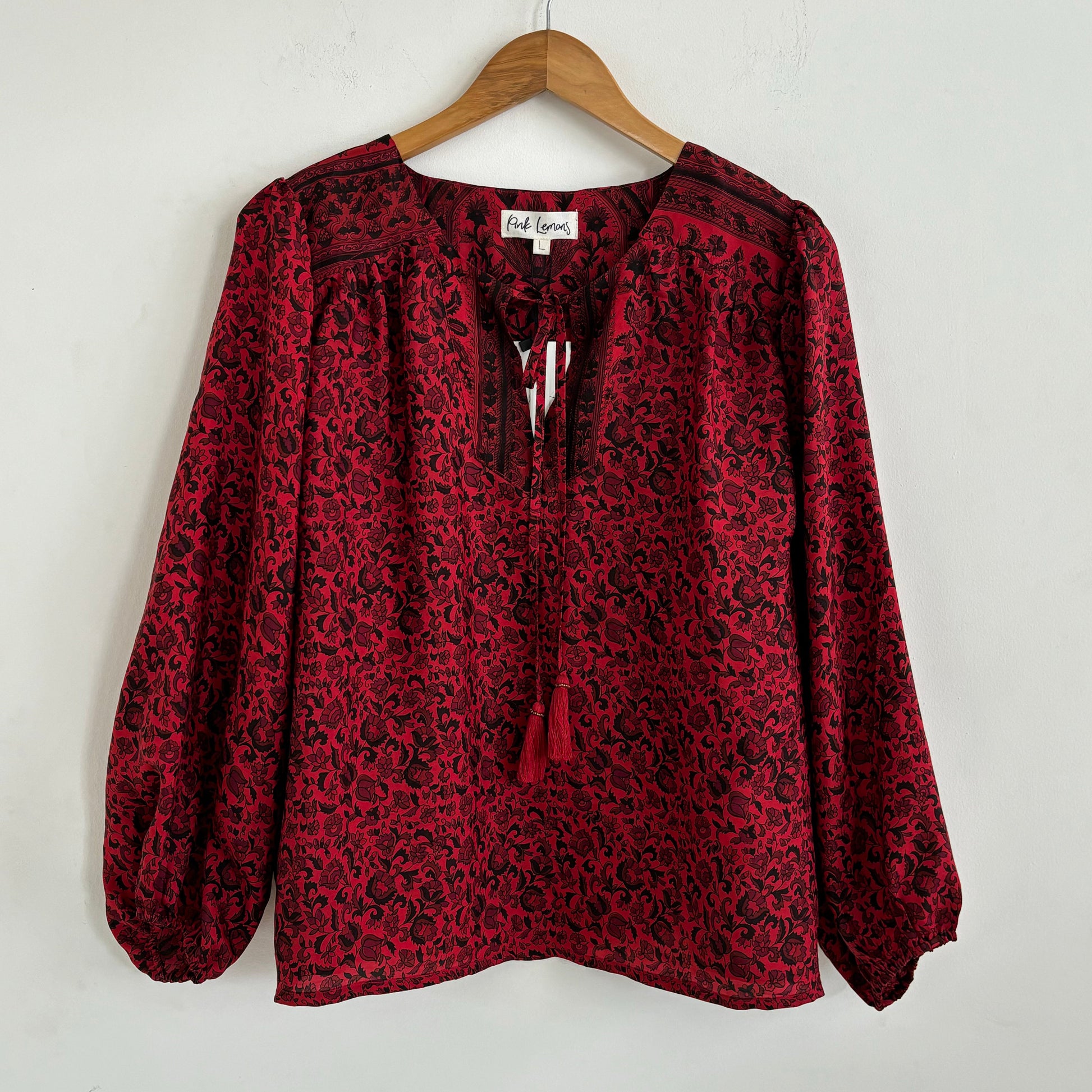 Lolita blouse has a loose breezy, feminine shape with puff shoulder detail and a front yoke with tassel ties. Lolita exudes charm and elegance with pretty details on the shoulders and front yoke ,she looks great with jeans , linen pants and skirts /shorts alike , she can be dressed up or down to suit the occasion. It has a swing shape that can be worn loose or tucked in . Super versatile .