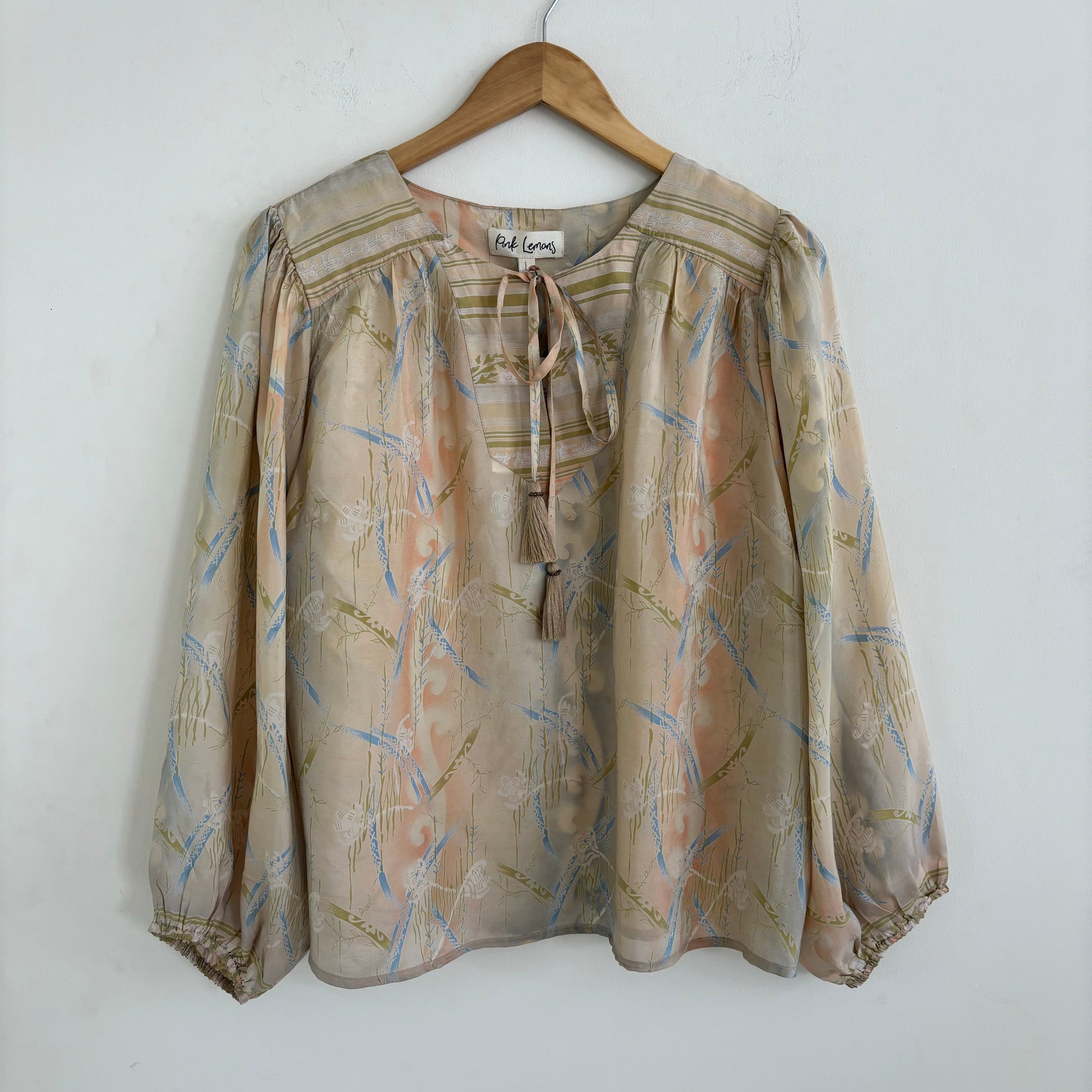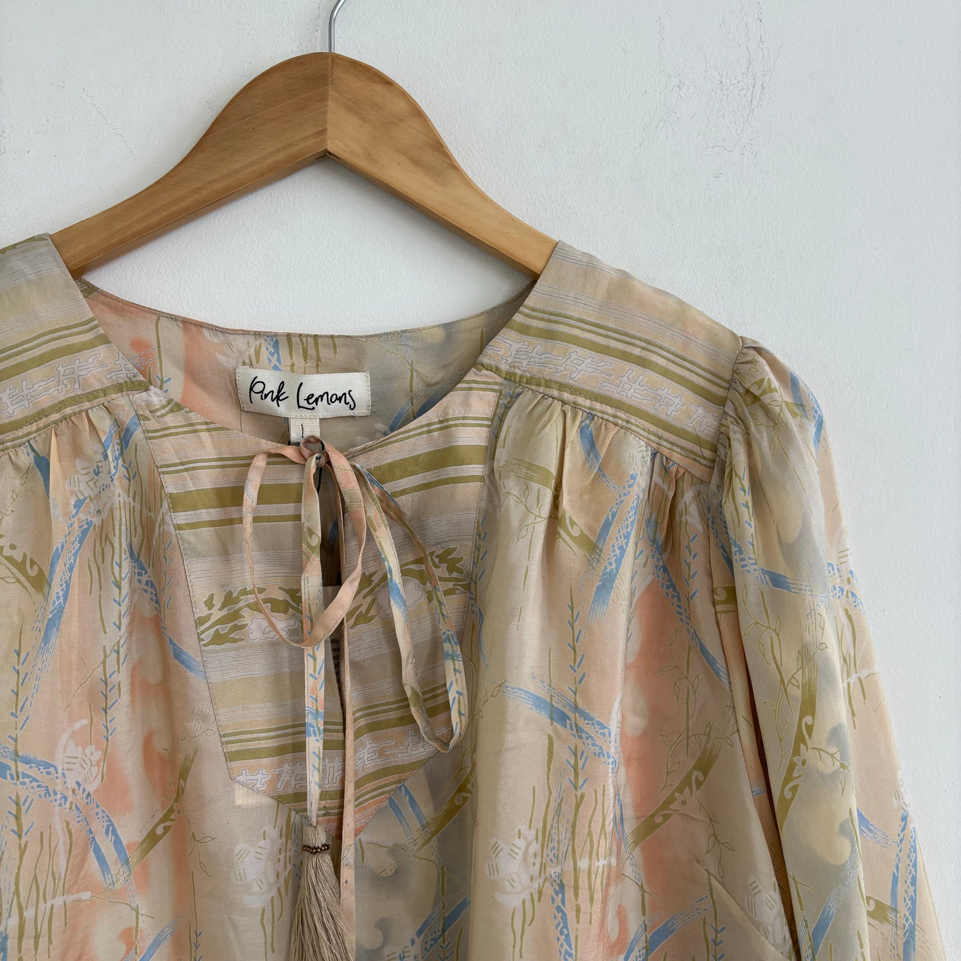 Lolita blouse has a loose breezy, feminine shape with puff shoulder detail and a front yoke with tassel ties. Lolita exudes charm and elegance with pretty details on the shoulders and front yoke ,she looks great with jeans , linen pants and skirts /shorts alike , she can be dressed up or down to suit the occasion. It has a swing shape that can be worn loose or tucked in . Super versatile .