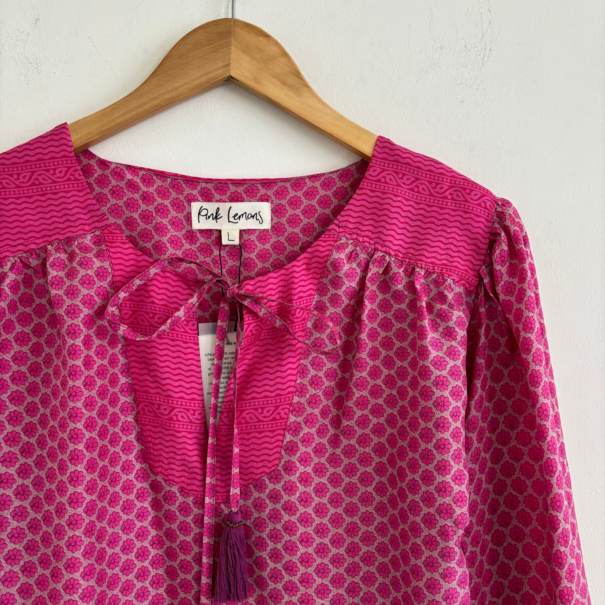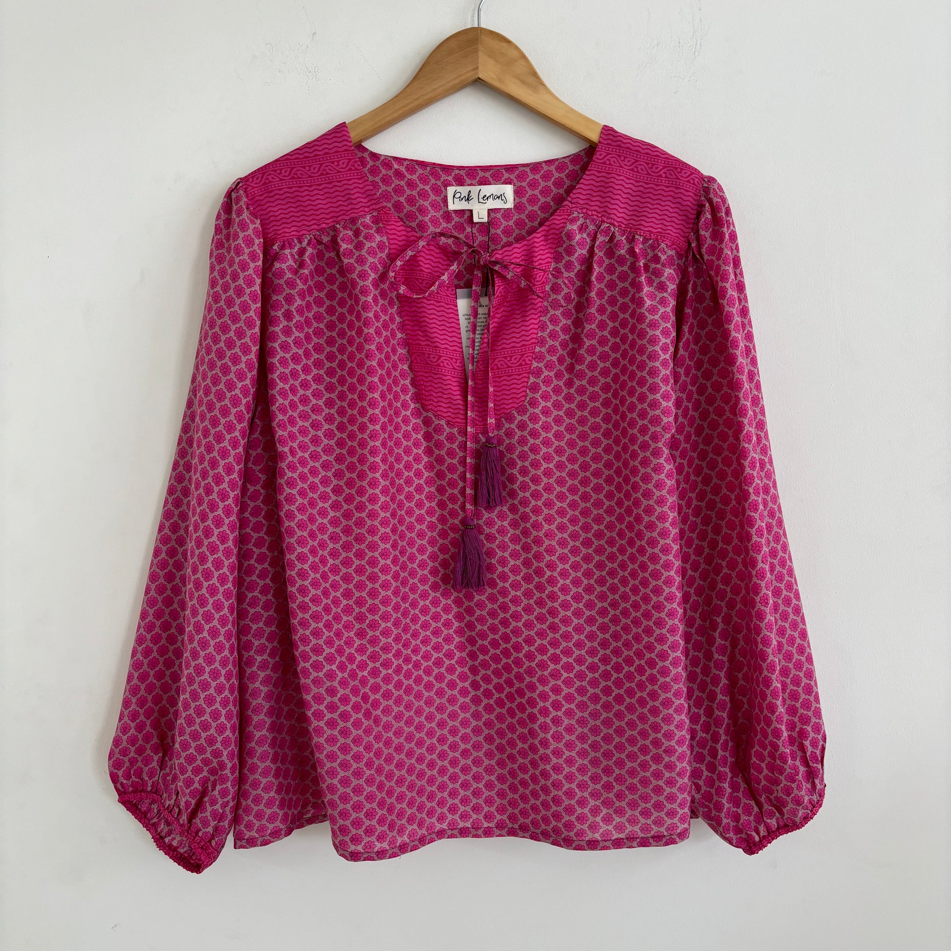 Lolita blouse has a loose breezy, feminine shape with puff shoulder detail and a front yoke with tassel ties. Lolita exudes charm and elegance with pretty details on the shoulders and front yoke ,she looks great with jeans , linen pants and skirts /shorts alike , she can be dressed up or down to suit the occasion. It has a swing shape that can be worn loose or tucked in . Super versatile .