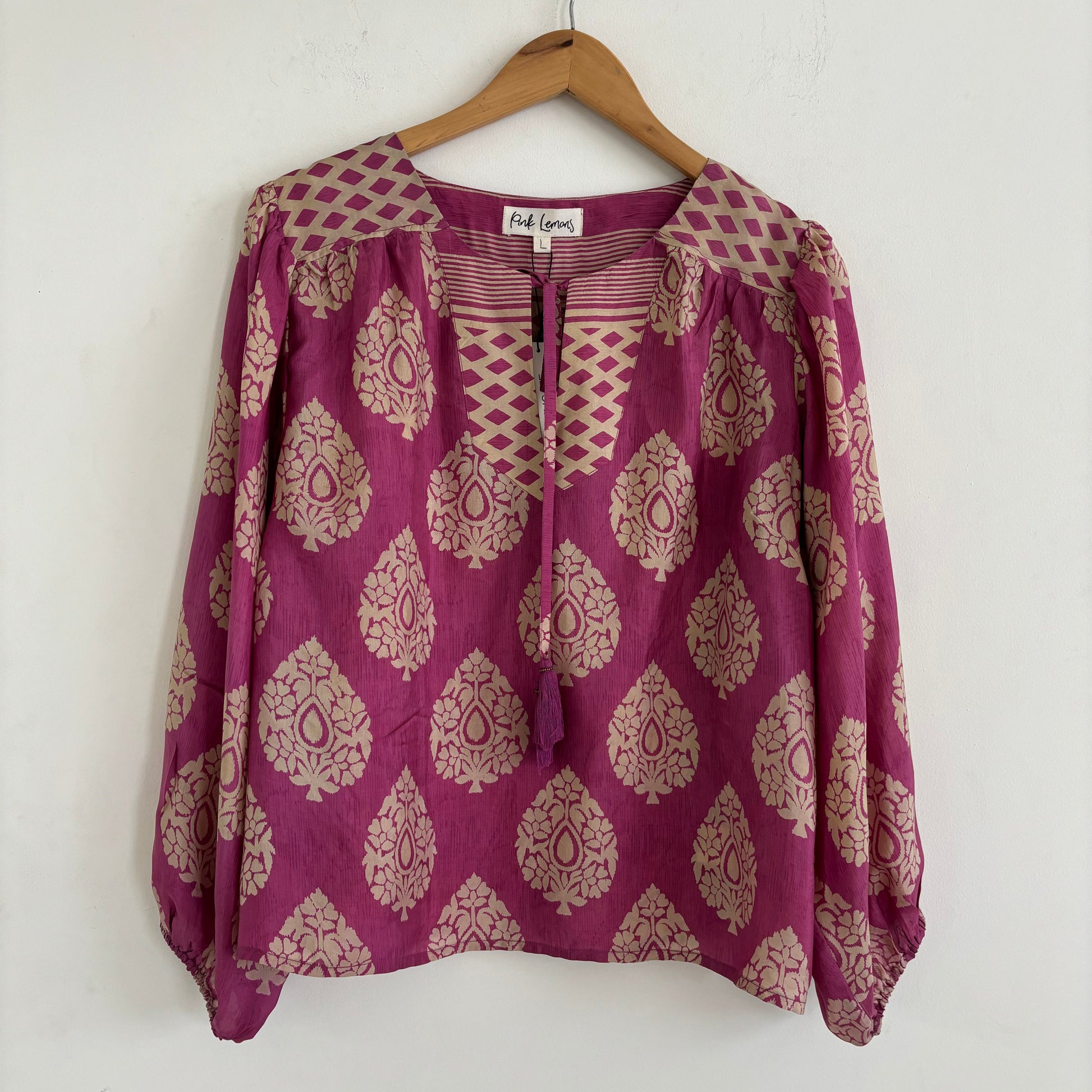 Lolita blouse has a loose breezy, feminine shape with puff shoulder detail and a front yoke with tassel ties. Lolita exudes charm and elegance with pretty details on the shoulders and front yoke ,she looks great with jeans , linen pants and skirts /shorts alike , she can be dressed up or down to suit the occasion. It has a swing shape that can be worn loose or tucked in . Super versatile .
