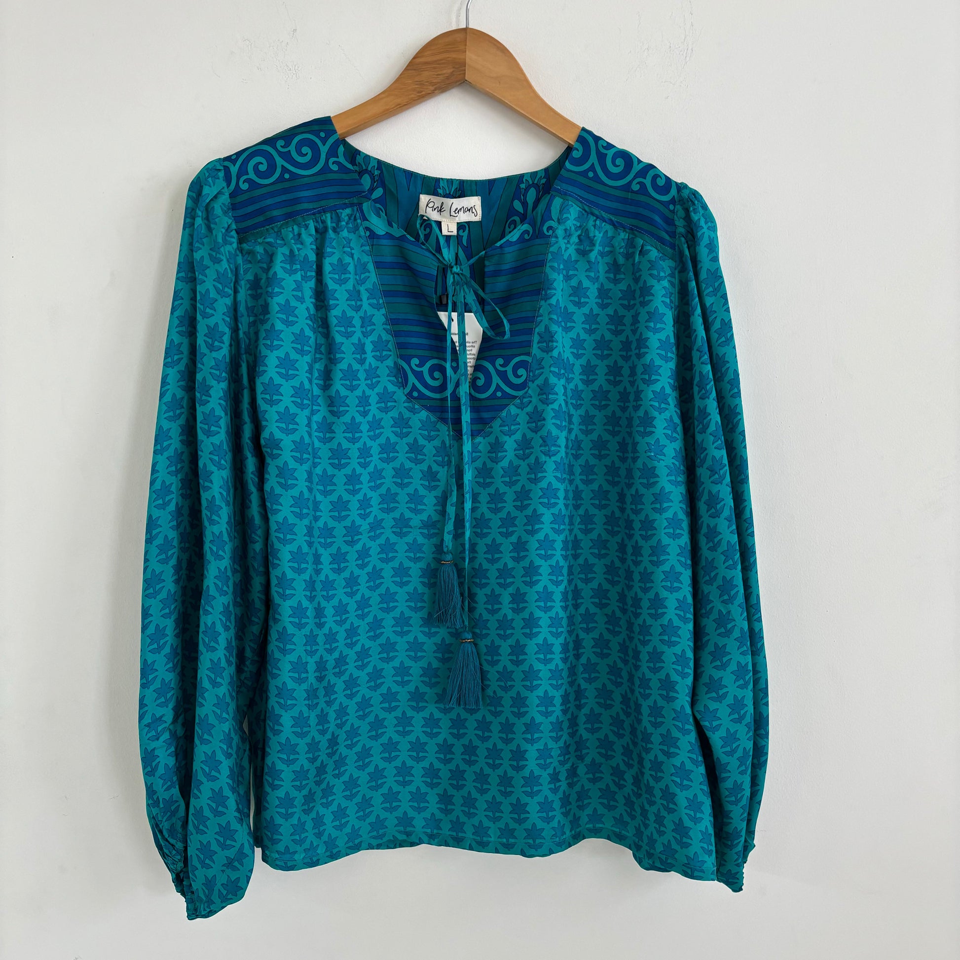 Lolita blouse has a loose breezy, feminine shape with puff shoulder detail and a front yoke with tassel ties. Lolita exudes charm and elegance with pretty details on the shoulders and front yoke ,she looks great with jeans , linen pants and skirts /shorts alike , she can be dressed up or down to suit the occasion. It has a swing shape that can be worn loose or tucked in . Super versatile .