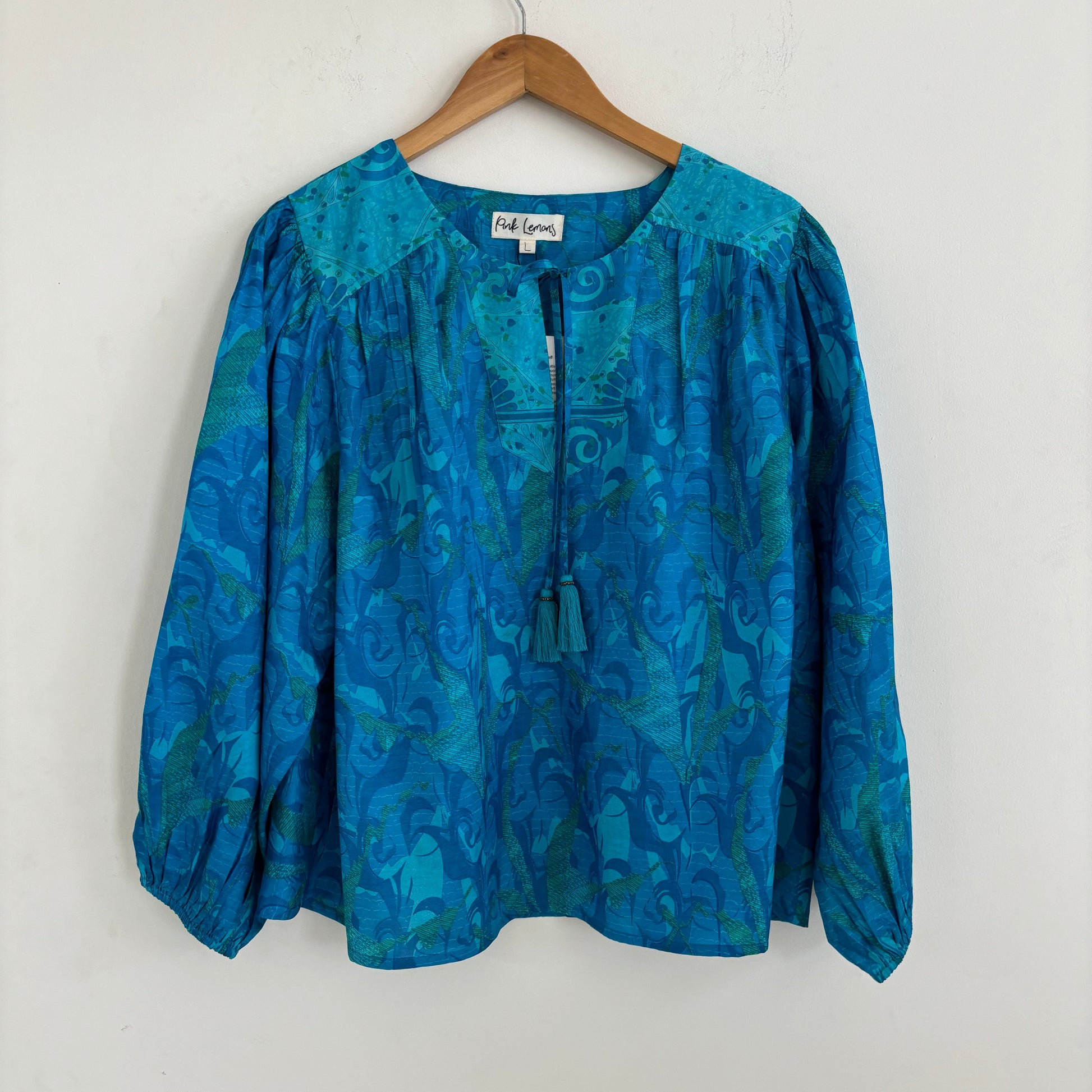 Lolita blouse has a loose breezy, feminine shape with puff shoulder detail and a front yoke with tassel ties. Lolita exudes charm and elegance with pretty details on the shoulders and front yoke ,she looks great with jeans , linen pants and skirts /shorts alike , she can be dressed up or down to suit the occasion. It has a swing shape that can be worn loose or tucked in . Super versatile .