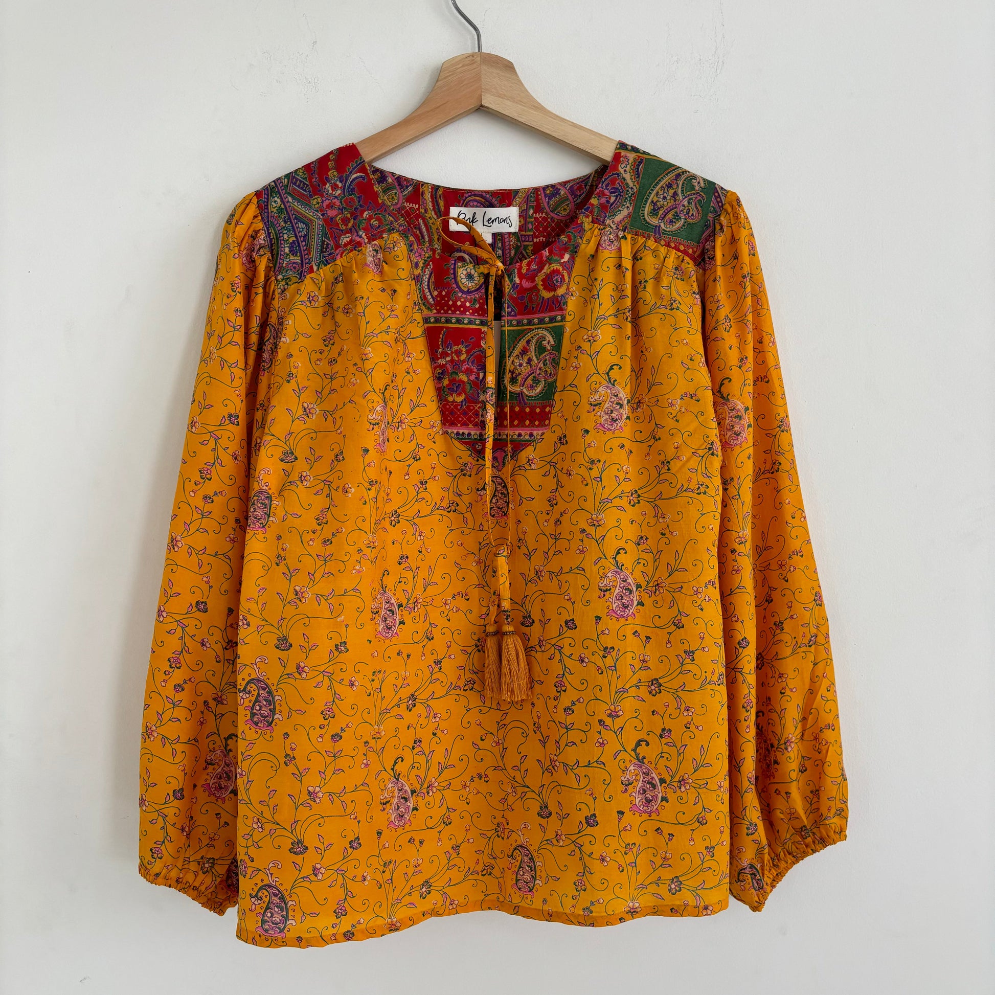 Lolita blouse has a loose breezy, feminine shape with puff shoulder detail and a front yoke with tassel ties. Lolita exudes charm and elegance with pretty details on the shoulders and front yoke ,she looks great with jeans , linen pants and skirts /shorts alike , she can be dressed up or down to suit the occasion. It has a swing shape that can be worn loose or tucked in . Super versatile .