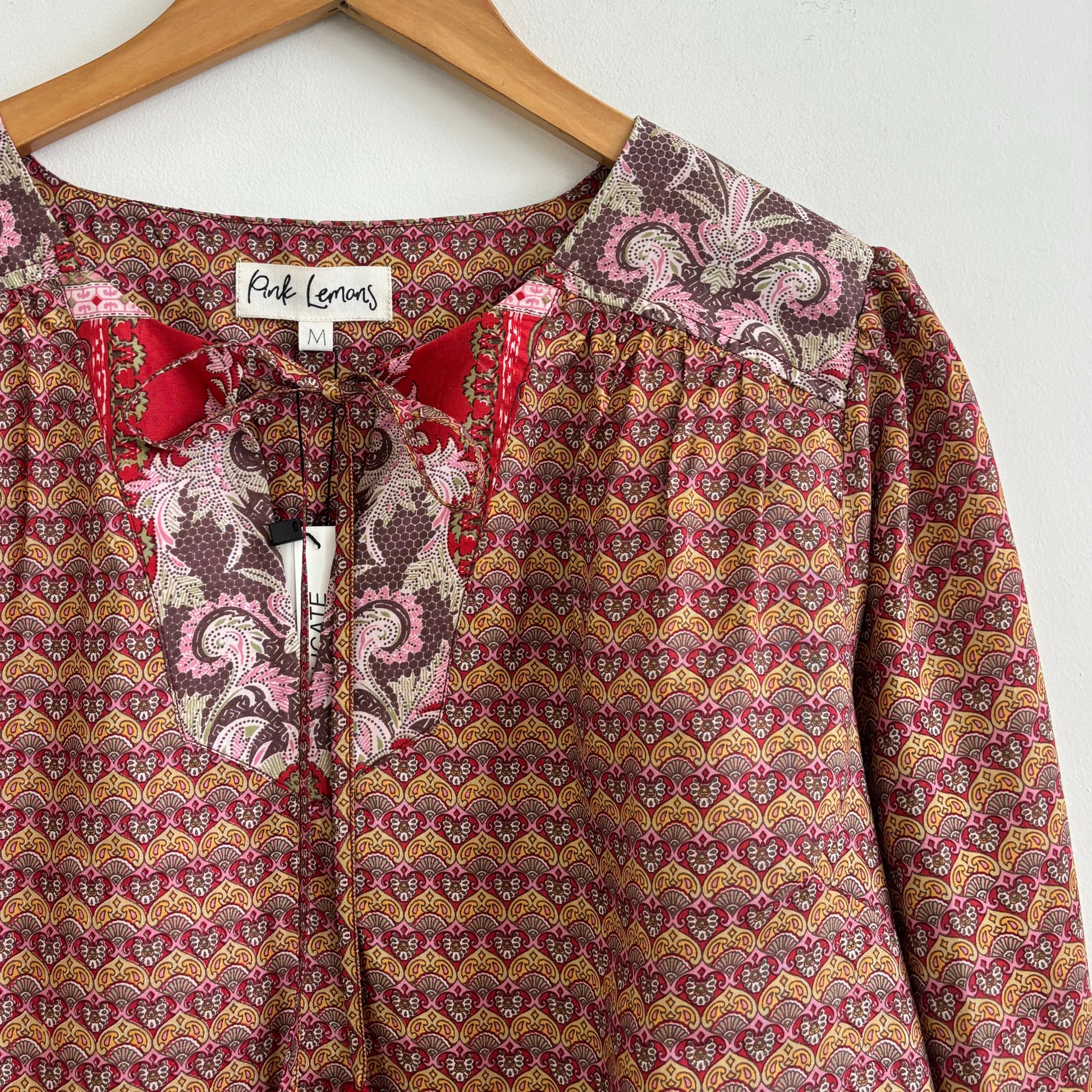 Lolita blouse has a loose breezy, feminine shape with puff shoulder detail and a front yoke with tassel ties. Lolita exudes charm and elegance with pretty details on the shoulders and front yoke ,she looks great with jeans , linen pants and skirts /shorts alike , she can be dressed up or down to suit the occasion. It has a swing shape that can be worn loose or tucked in . Super versatile .