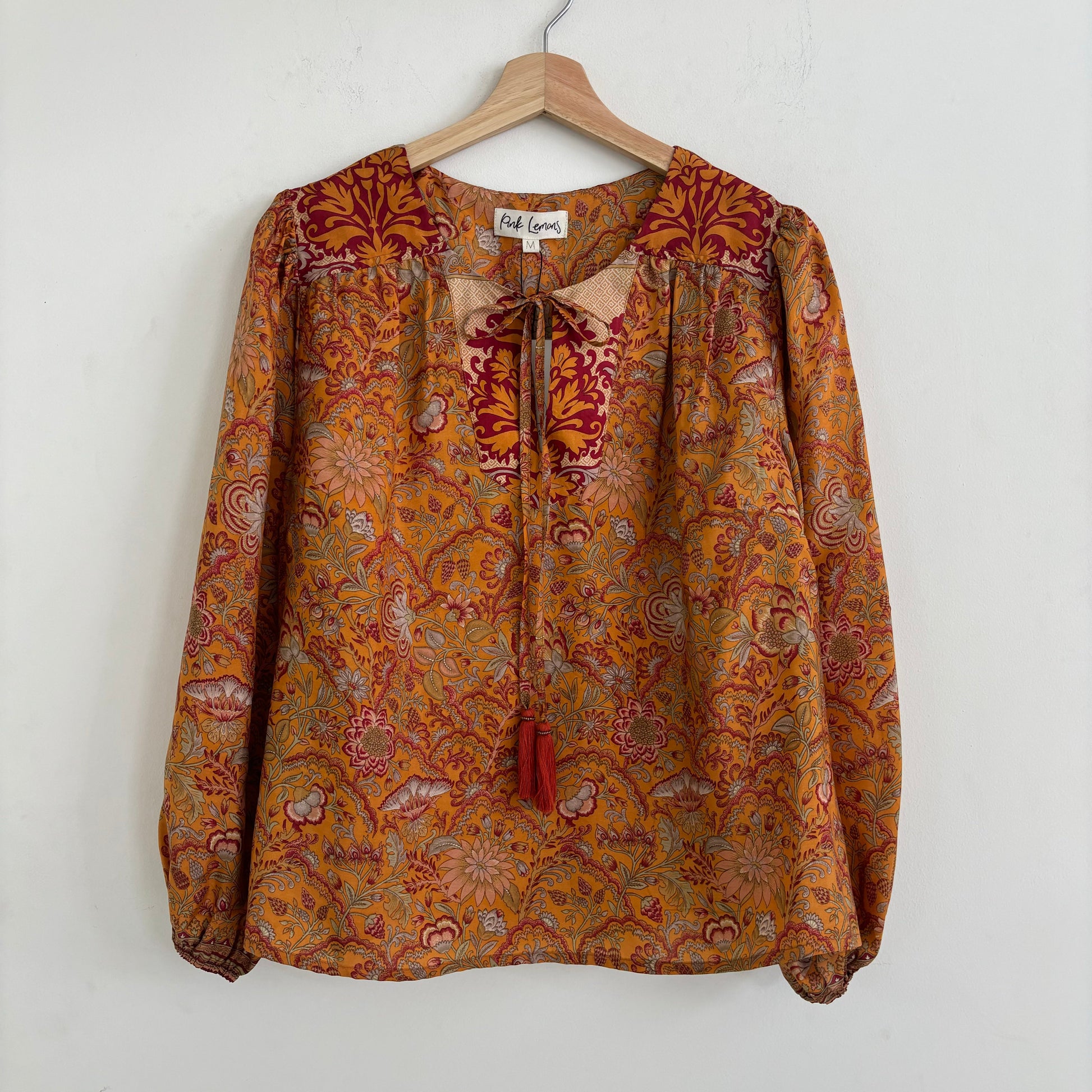 Lolita blouse has a loose breezy, feminine shape with puff shoulder detail and a front yoke with tassel ties. Lolita exudes charm and elegance with pretty details on the shoulders and front yoke ,she looks great with jeans , linen pants and skirts /shorts alike , she can be dressed up or down to suit the occasion. It has a swing shape that can be worn loose or tucked in . Super versatile .