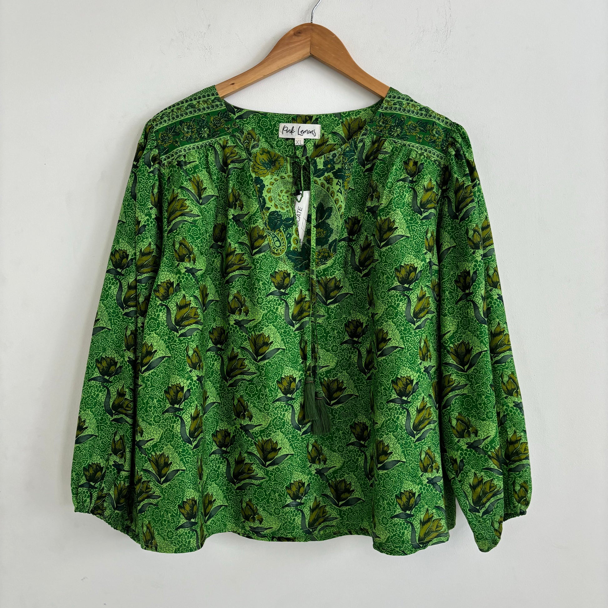 Lolita blouse has a loose breezy, feminine shape with puff shoulder detail and a front yoke with tassel ties. Lolita exudes charm and elegance with pretty details on the shoulders and front yoke ,she looks great with jeans , linen pants and skirts /shorts alike , she can be dressed up or down to suit the occasion. It has a swing shape that can be worn loose or tucked in . Super versatile .