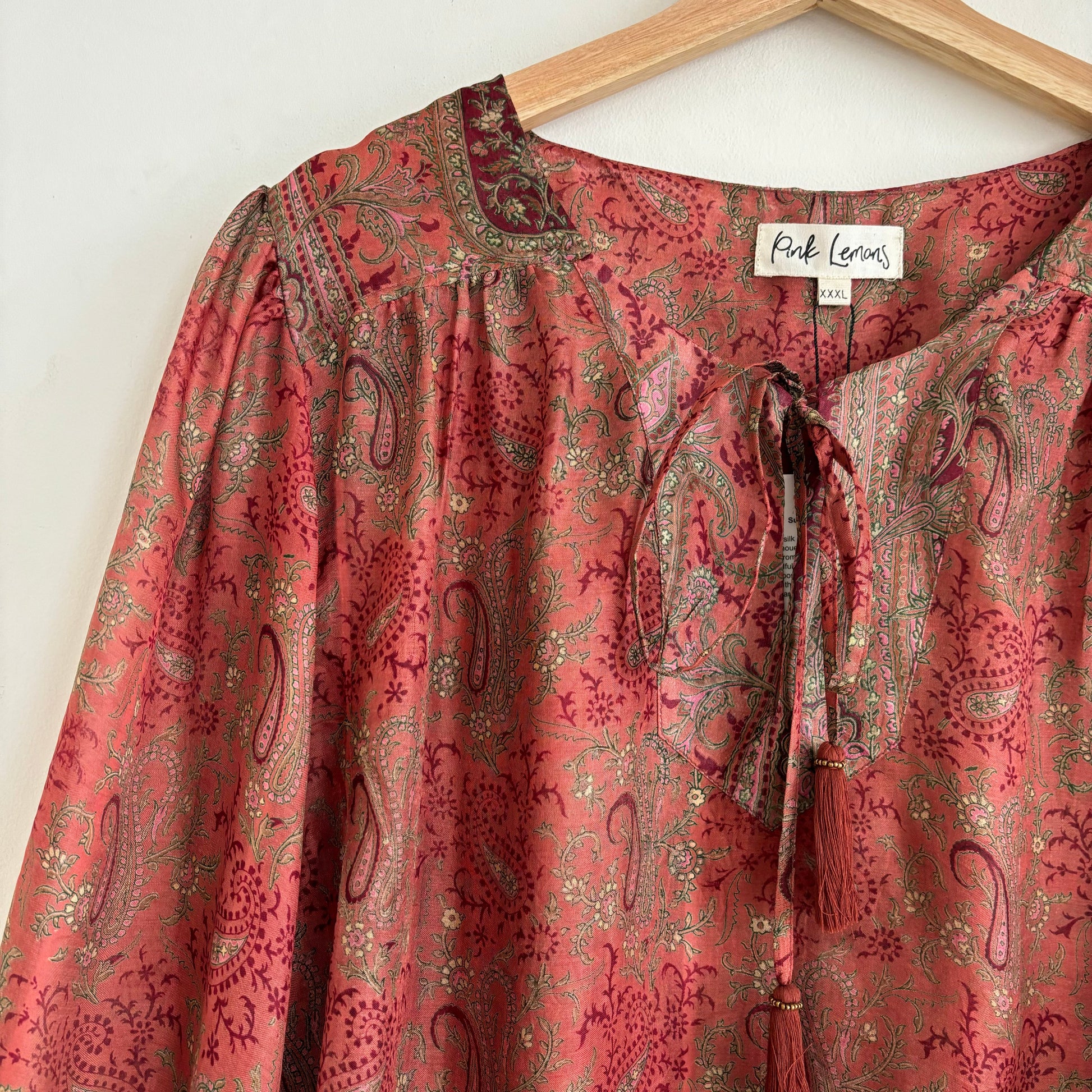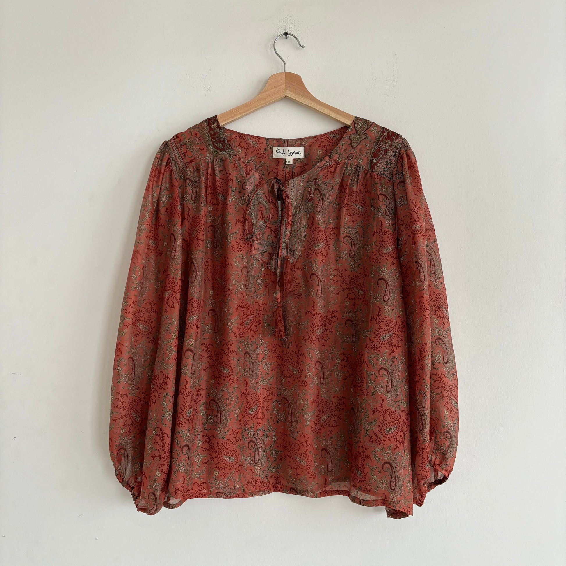 Lolita blouse has a loose breezy, feminine shape with puff shoulder detail and a front yoke with tassel ties. Lolita exudes charm and elegance with pretty details on the shoulders and front yoke ,she looks great with jeans , linen pants and skirts /shorts alike , she can be dressed up or down to suit the occasion. It has a swing shape that can be worn loose or tucked in . Super versatile .