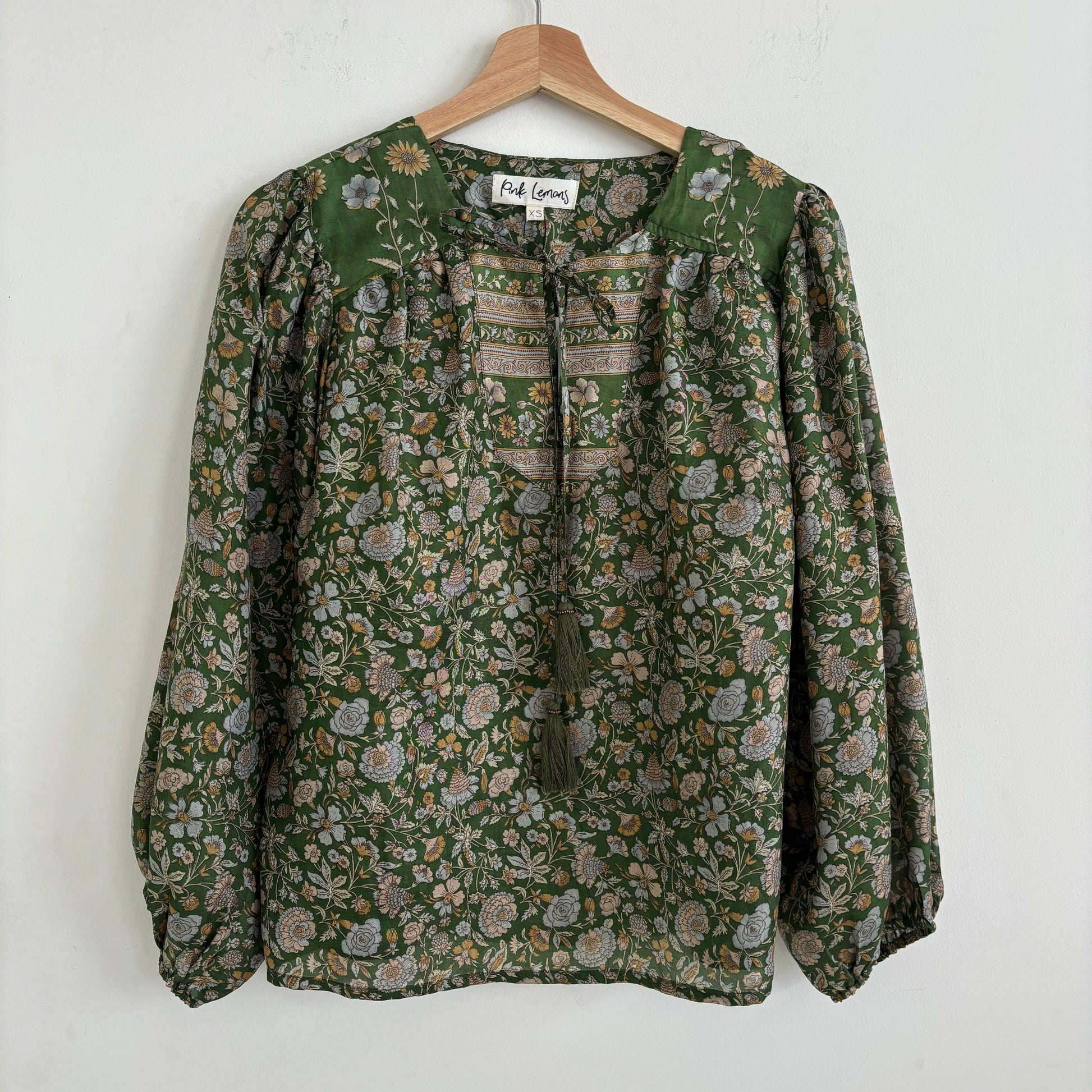 Lolita blouse has a loose breezy, feminine shape with puff shoulder detail and a front yoke with tassel ties. Lolita exudes charm and elegance with pretty details on the shoulders and front yoke ,she looks great with jeans , linen pants and skirts /shorts alike , she can be dressed up or down to suit the occasion. It has a swing shape that can be worn loose or tucked in . Super versatile .