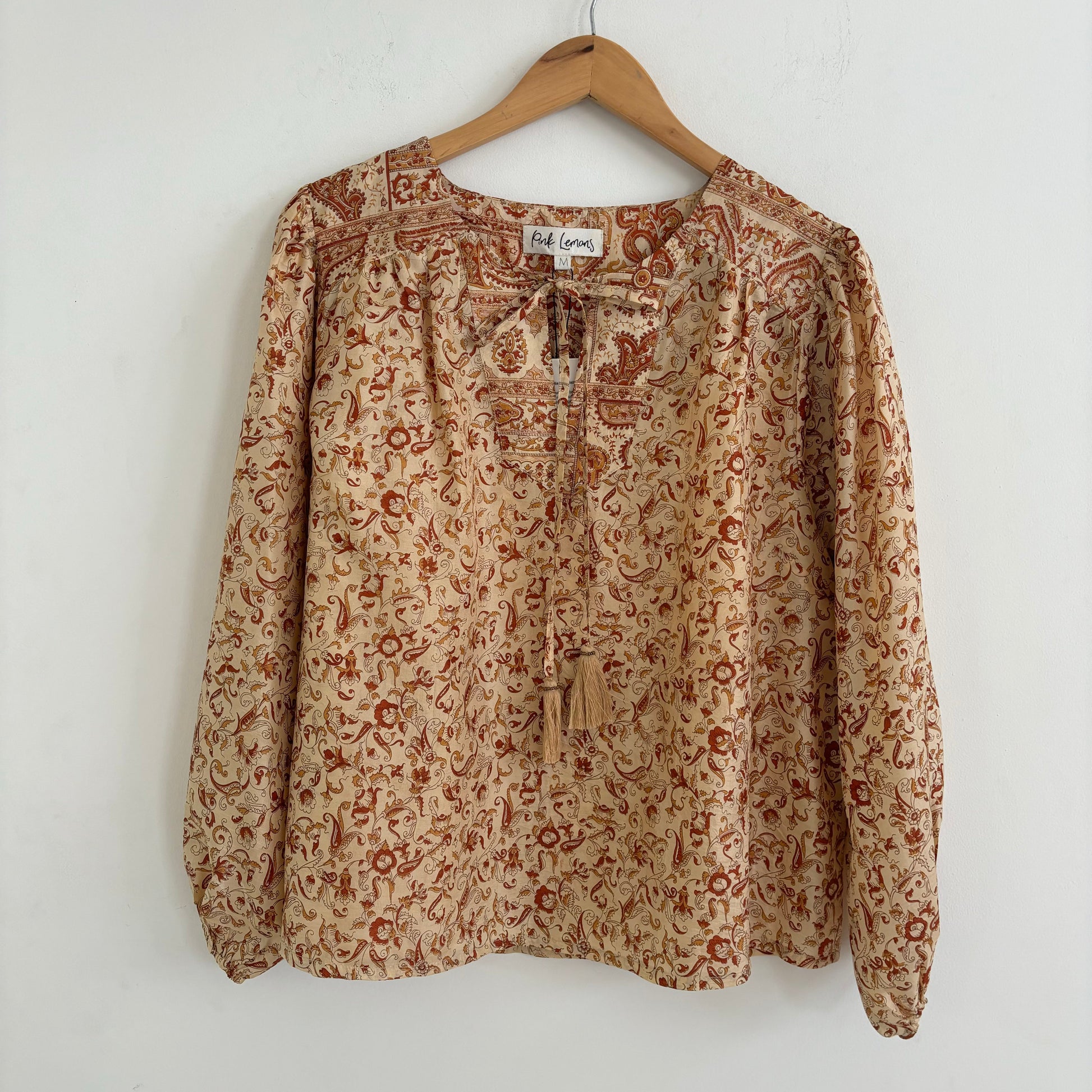 Lolita blouse has a loose breezy, feminine shape with puff shoulder detail and a front yoke with tassel ties. Lolita exudes charm and elegance with pretty details on the shoulders and front yoke ,she looks great with jeans , linen pants and skirts /shorts alike , she can be dressed up or down to suit the occasion. It has a swing shape that can be worn loose or tucked in . Super versatile .
